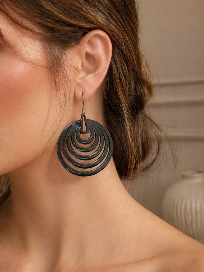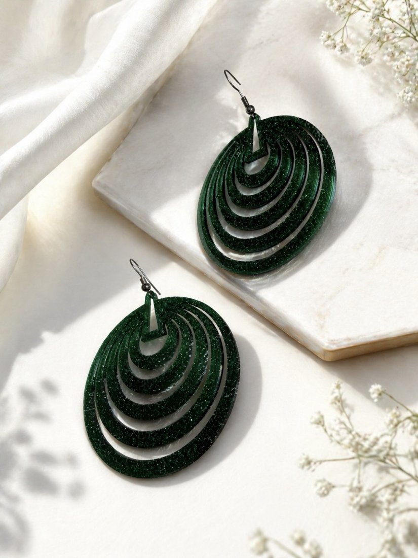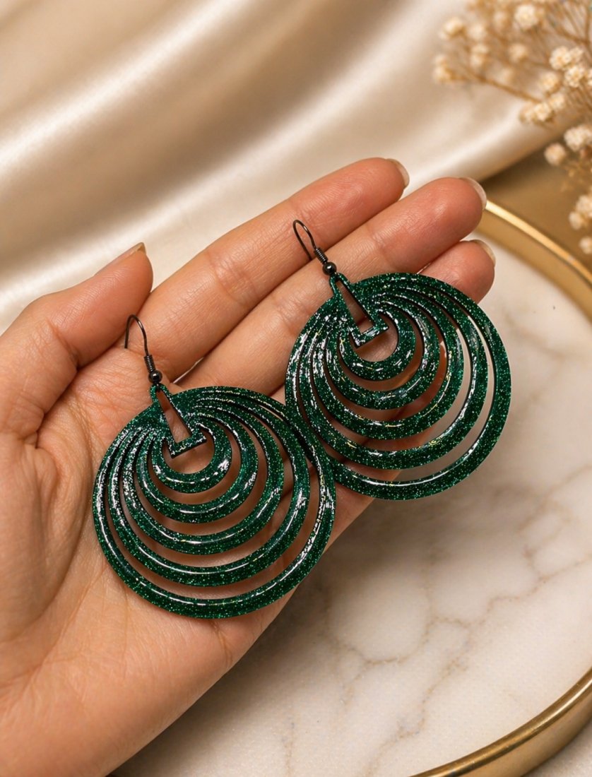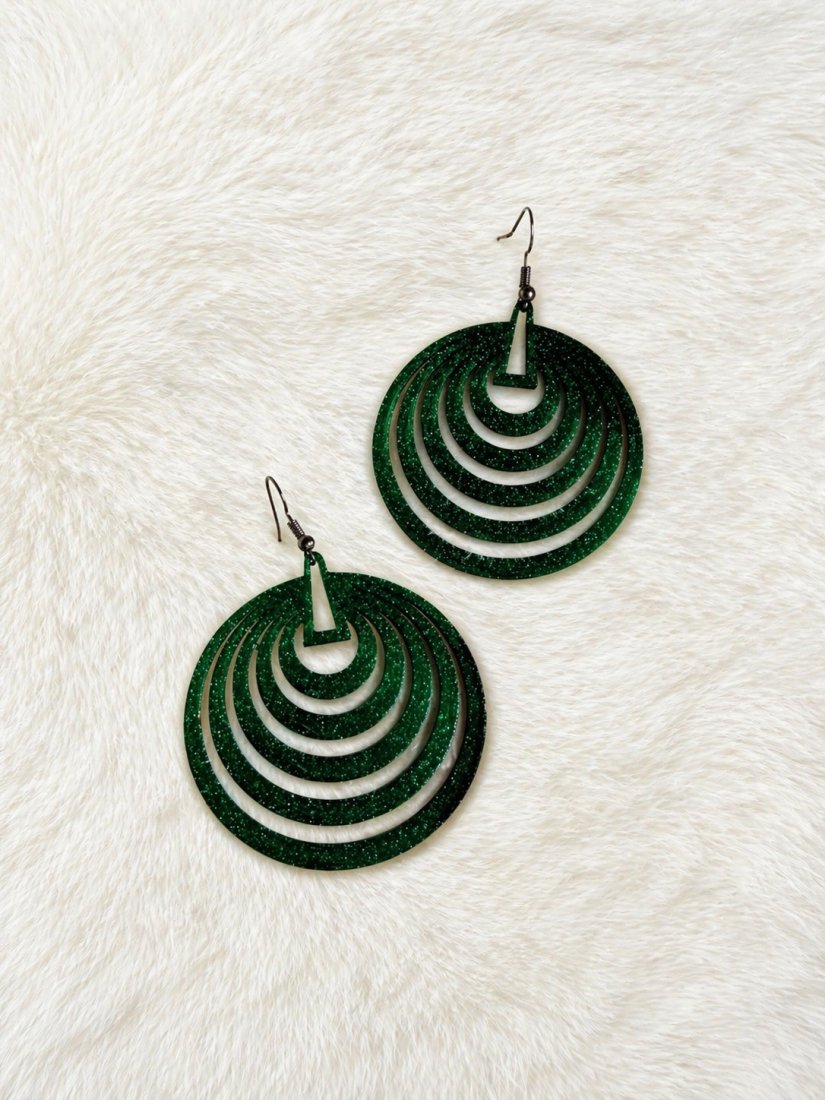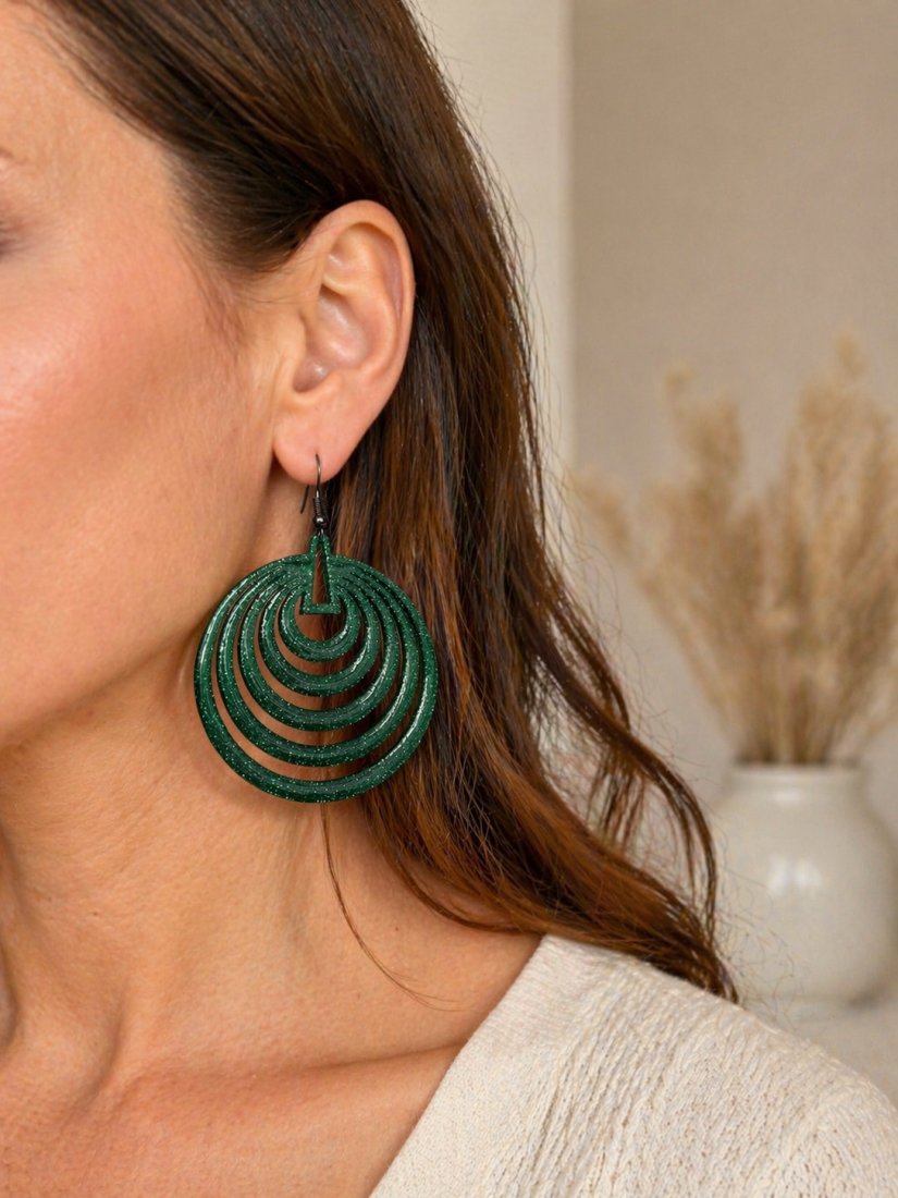 Efektowne zielone kolczyki koła o ażurowej formie. Lekkie, błyszczące i przyciągające spojrzenia – jeden dodatek, który robi całą stylizację.