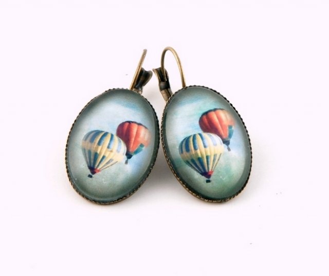 Kolczyki stanowią malarską, niebanalną formę biżuterii z grafiką za szkłem w stylu vintage. Grafika jest opracowana przeze mnie tak, aby sprawiała wrażenie przestrzenności. Obrazek jest umieszczony w bazie w kolorze antycznego złota. Kolor tła jest błękitno- miętowy- zielony.