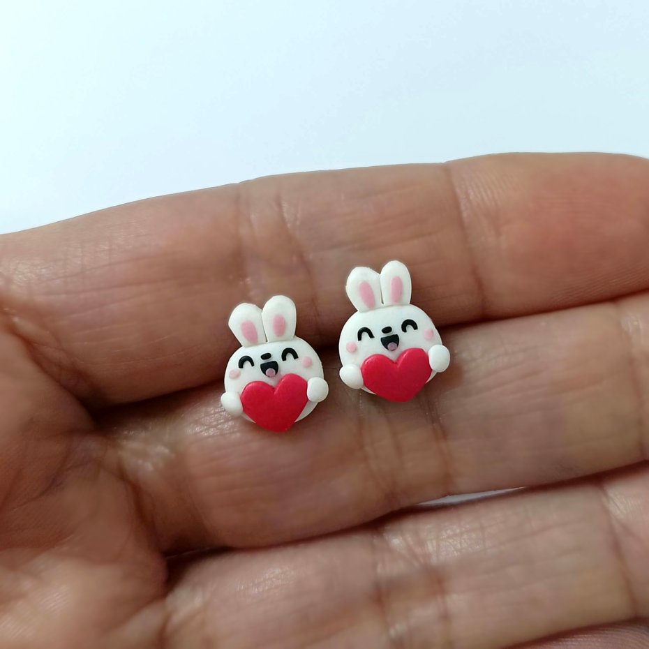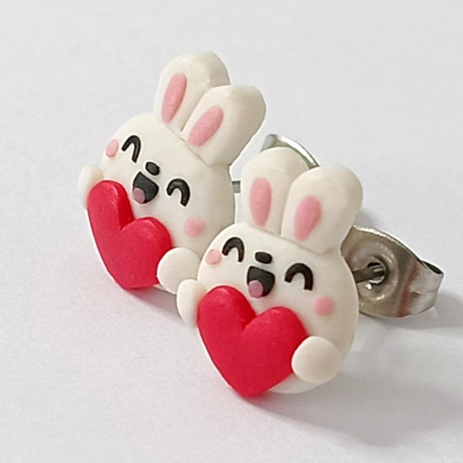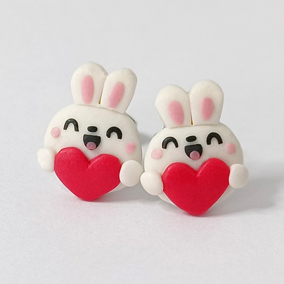 Urocze kolczyki sztyfty w kształcie białych króliczków trzymających czerwone serduszka. Ręcznie wykonane z masy polimerowej, zachwycają wyrazem i starannym dopracowaniem detali.