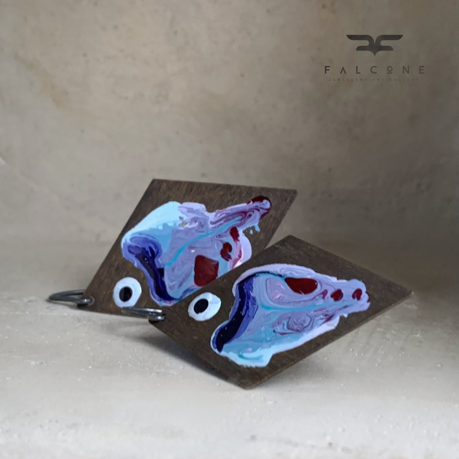 Unikalne kolczyki. Pojedynczy egzemplarz. Duże, efektowne kolczyki z mosiądzu, z motywem ryb. Mosiądz fakturowany, repusowany, o drapanej powierzchni patynowanej na chłodny brąz. Ryby zdobione ręcznie emalią w tonacjach błękitu, granatu i turkusowej zieleni, z domieszką fioletu i rubinu. Kolorystyka utrzymana w chłodnych barwach. Bigle typu haki ze srebra 925. Szerokość kolczyków to ok. 3 cm. Długość kolczyków to ok. 5 cm.