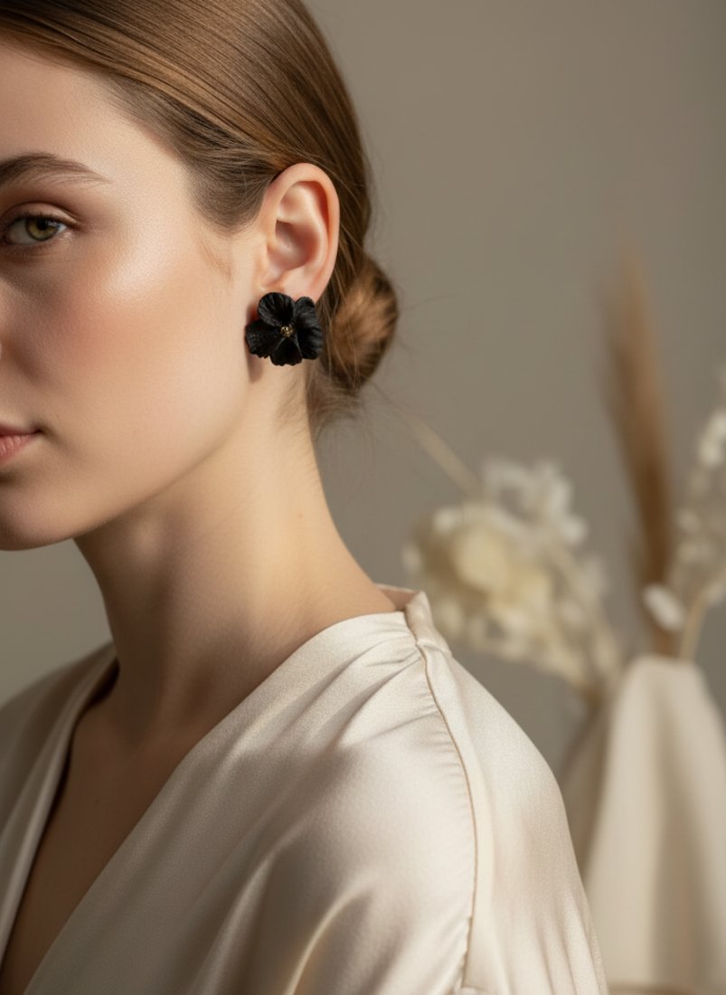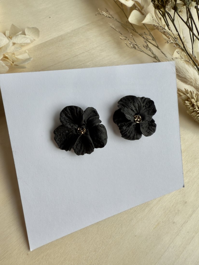 Eleganckie kolczyki w kształcie pełnych kwiatów, ręcznie formowane z gliny polimerowej. Miękkie, fakturowane płatki pięknie układają się na uchu, a złoty środek dodaje im biżuteryjnego charakteru.