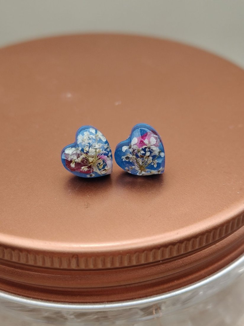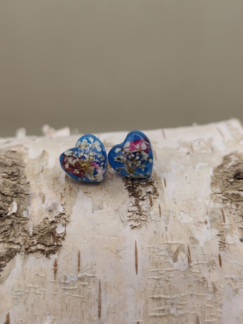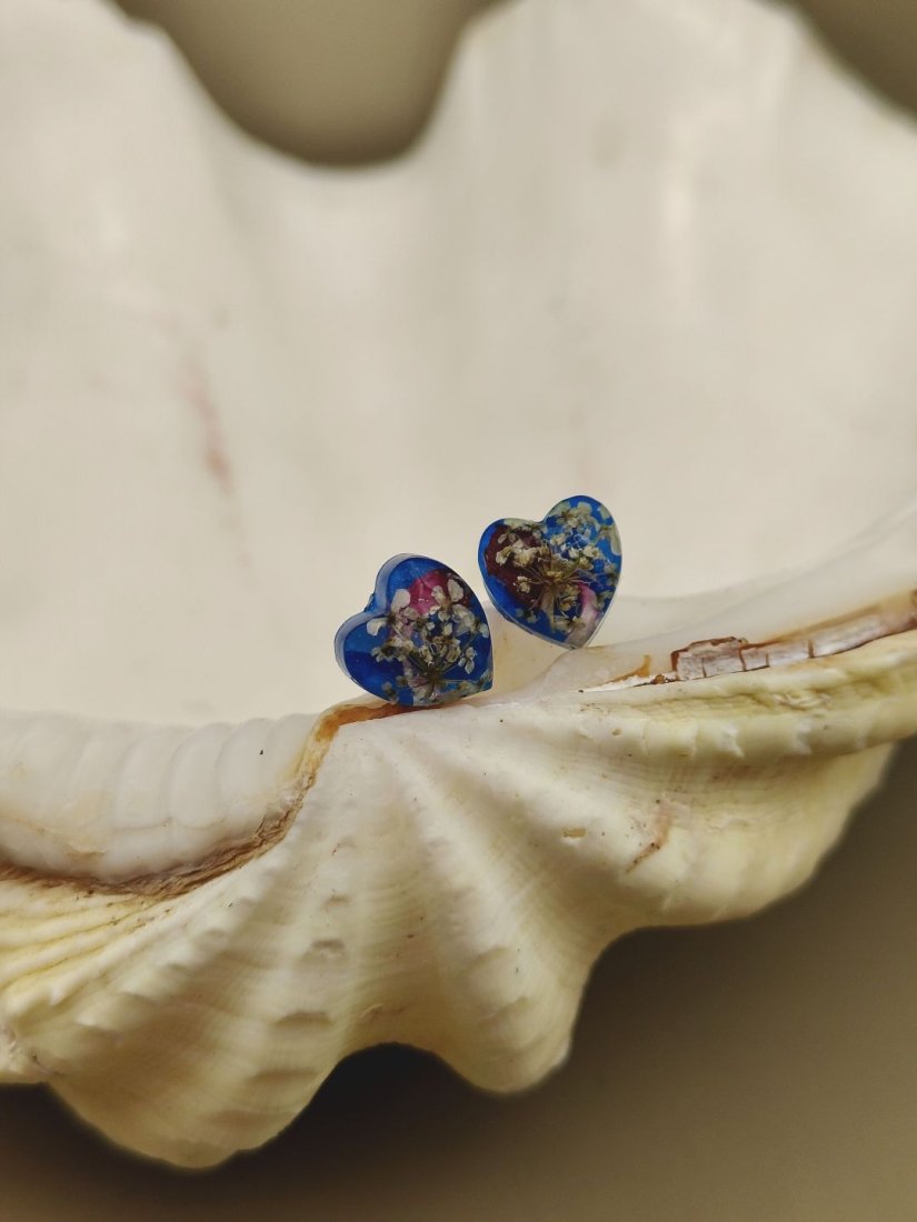 Romantyczne kolczyki w kształcie serc, wykonane z przejrzystej żywicy, w której zatopiono delikatne, prawdziwe kwiaty. Ich subtelna kompozycja w odcieniach błękitu, bieli i różu przywodzi na myśl letnią łąkę skąpaną w słońcu. To wyjątkowa biżuteria, która łączy naturalne piękno z rękodzielniczą precyzją — idealna dla osób ceniących oryginalność i lekkość stylu. Doskonale sprawdzą się zarówno na co dzień, jak i jako romantyczny akcent do eleganckich stylizacji.