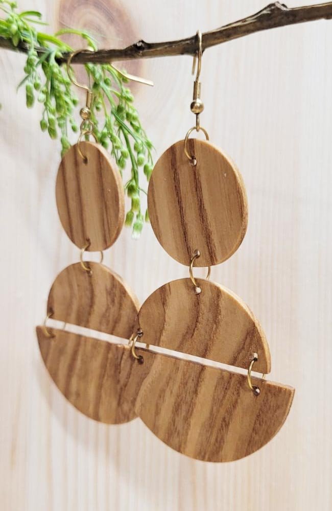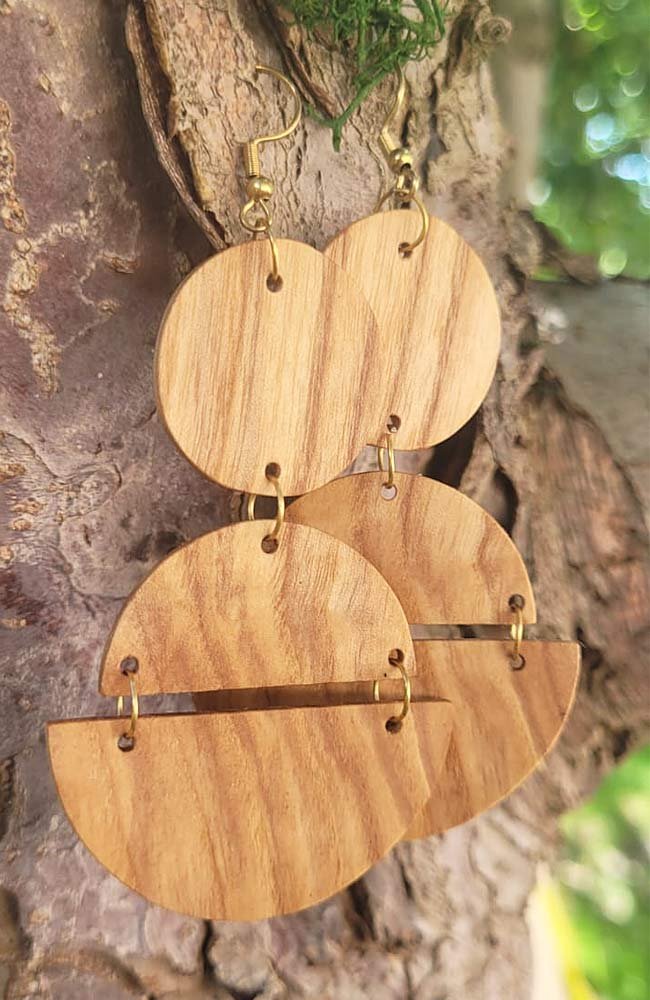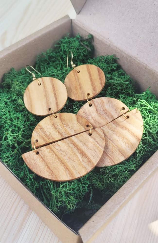 Długie, wiszące kolczyki wykonane ręcznie z drewna jesionowego lub z egzotycznego drewna cumaru (do wyboru). Elementy drewniane starannie szlifujemy i zabezpieczamy olejem.