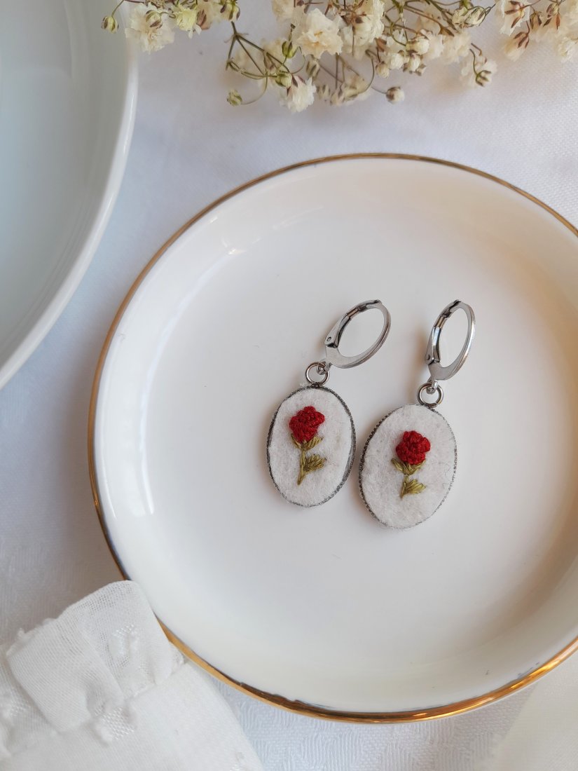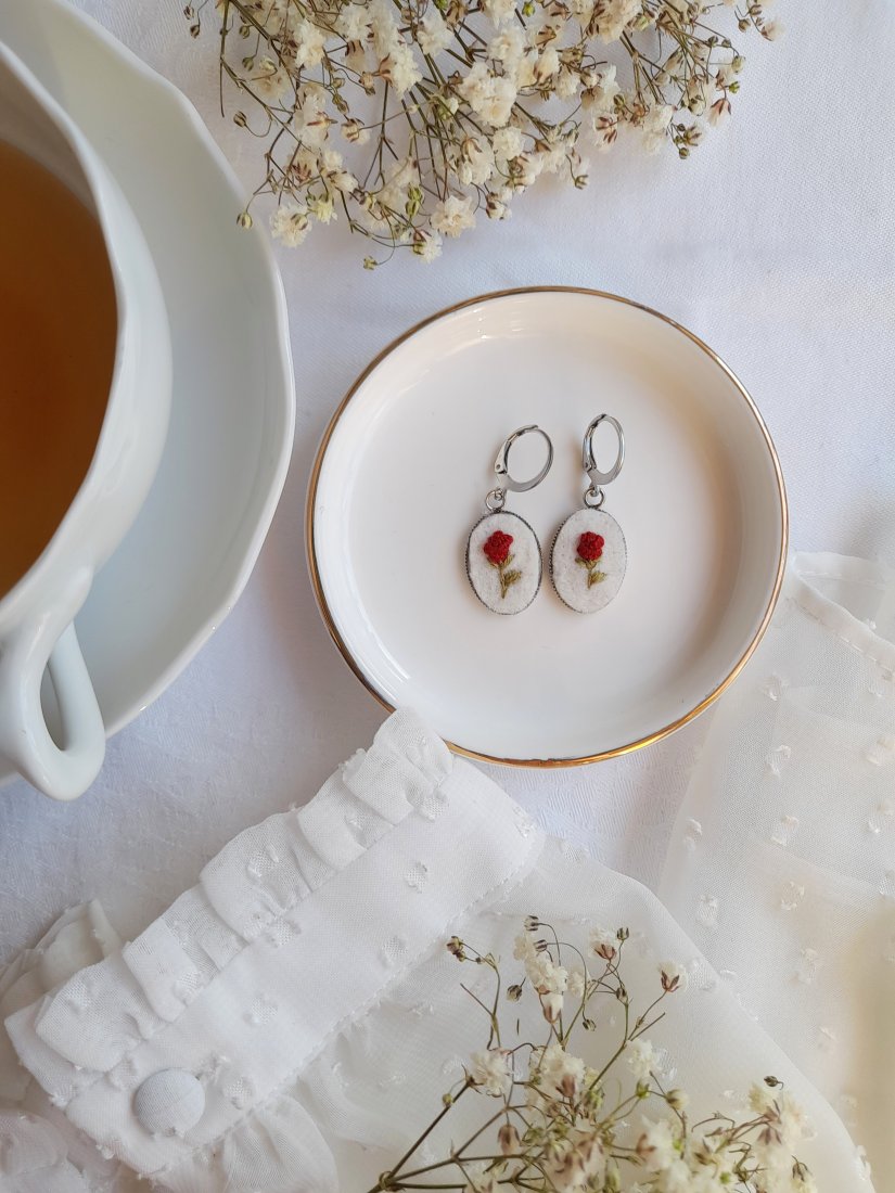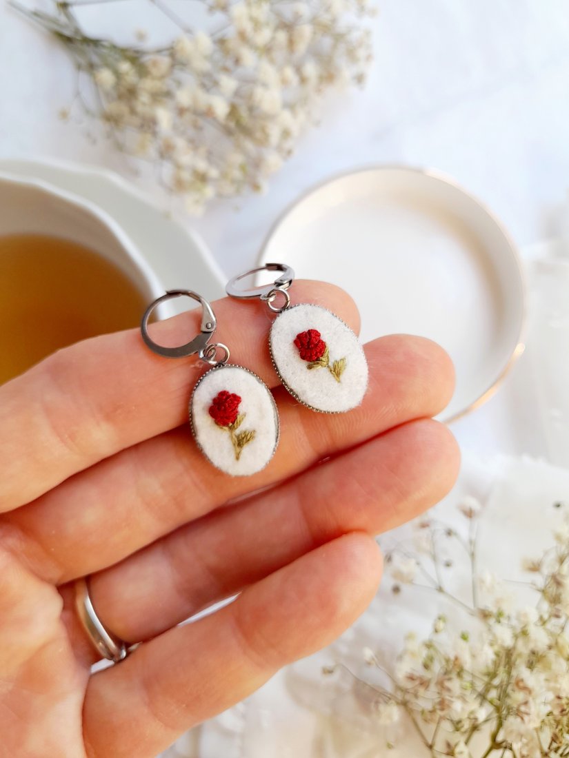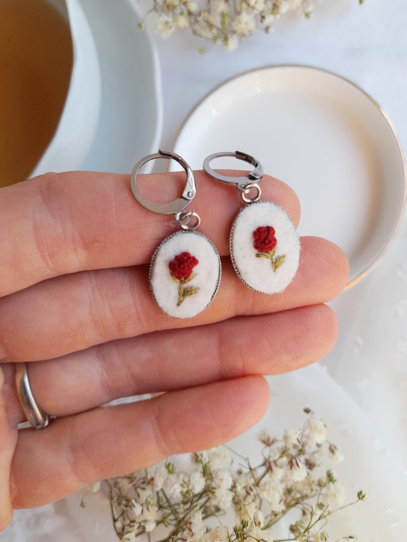 Delikatne, lekkie, haftowane ręcznie kolczyki z różami w ciemnym bordo dla wielbicielek niepowtarzalnej kwiatowej biżuterii.