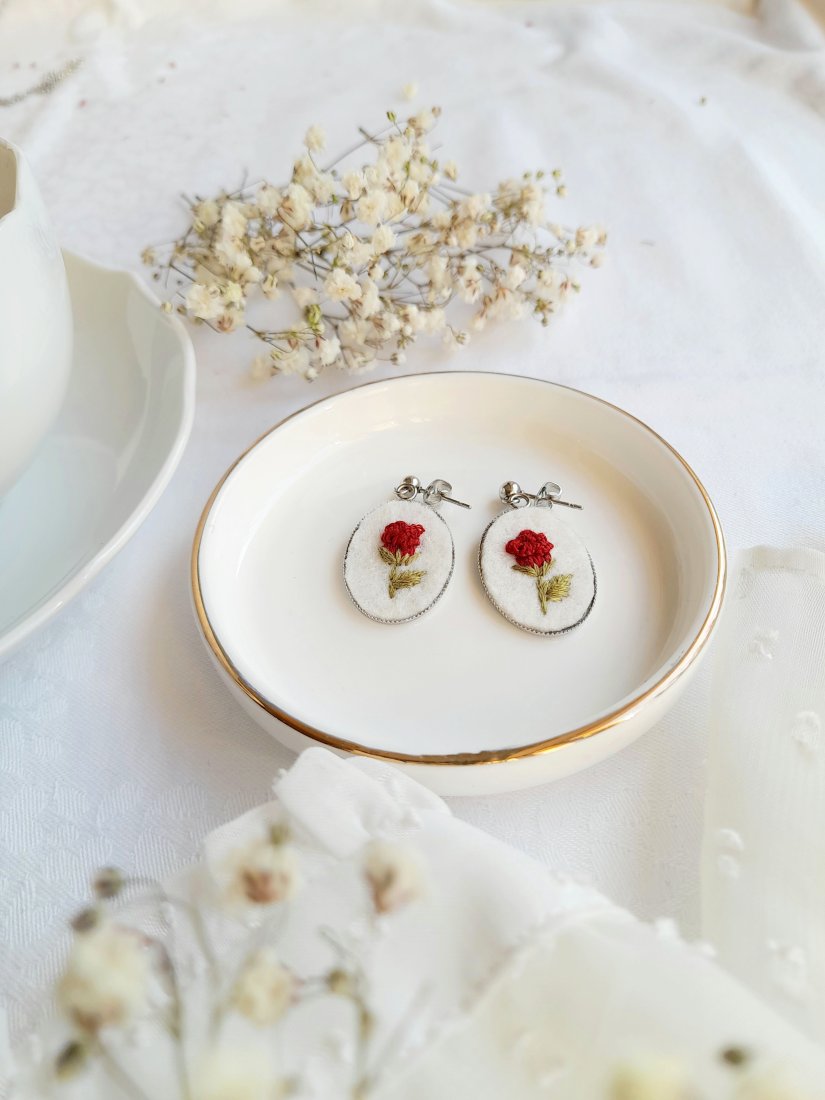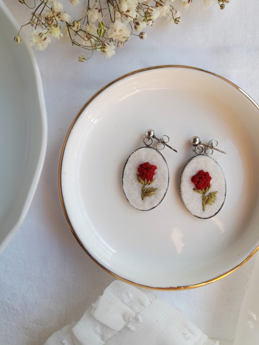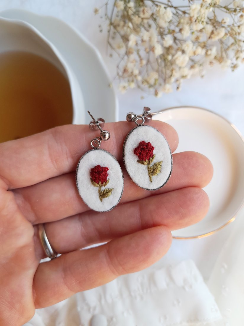 Delikatne, lekkie, haftowane ręcznie kolczyki z różami w ciemnym bordo dla wielbicielek niepowtarzalnej kwiatowej biżuterii.