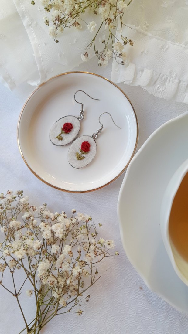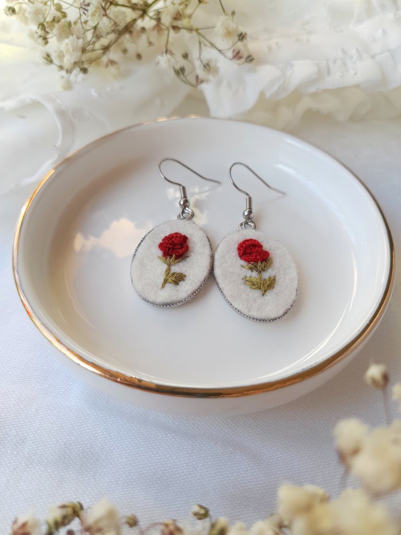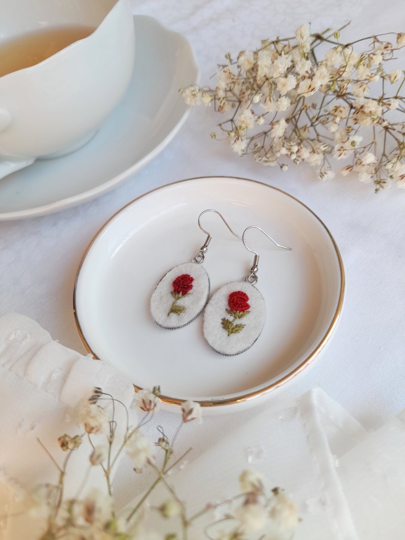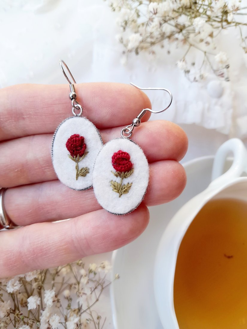Delikatne, lekkie, haftowane ręcznie kolczyki z różami w ciemnym bordo dla wielbicielek niepowtarzalnej kwiatowej biżuterii.