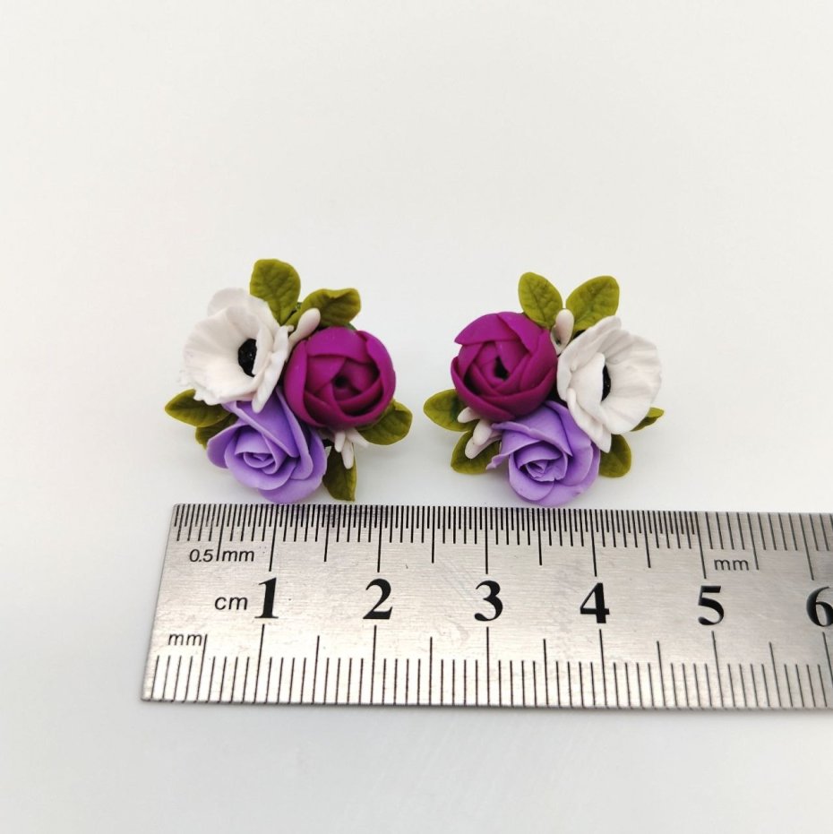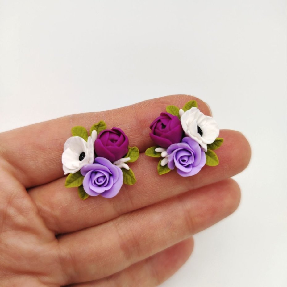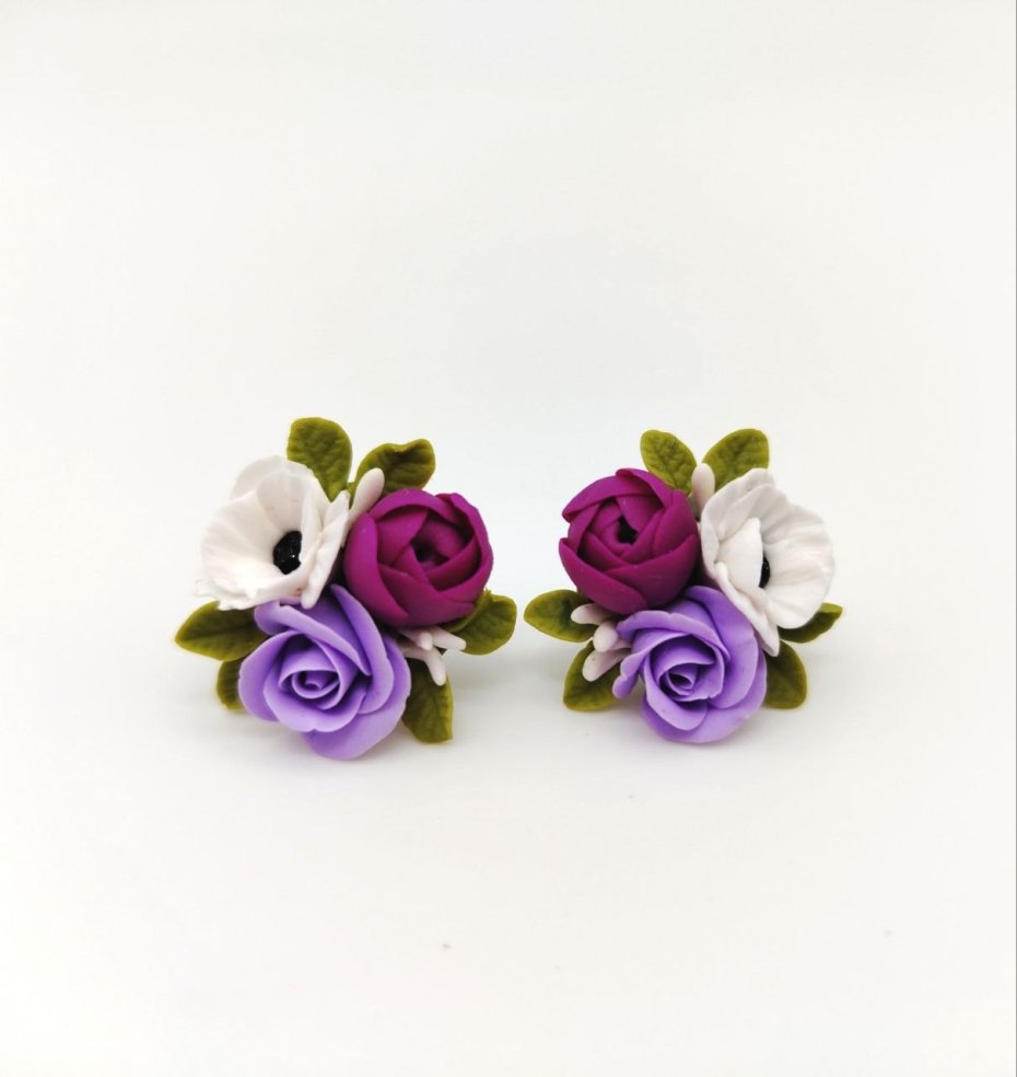 Każdy element został starannie uformowany z zapiekanej gliny polimerowej, tworząc realistyczną, delikatną kompozycję kwiatową. To biżuteria, która przyciąga spojrzenia swoją subtelnością i wyjątkowością.