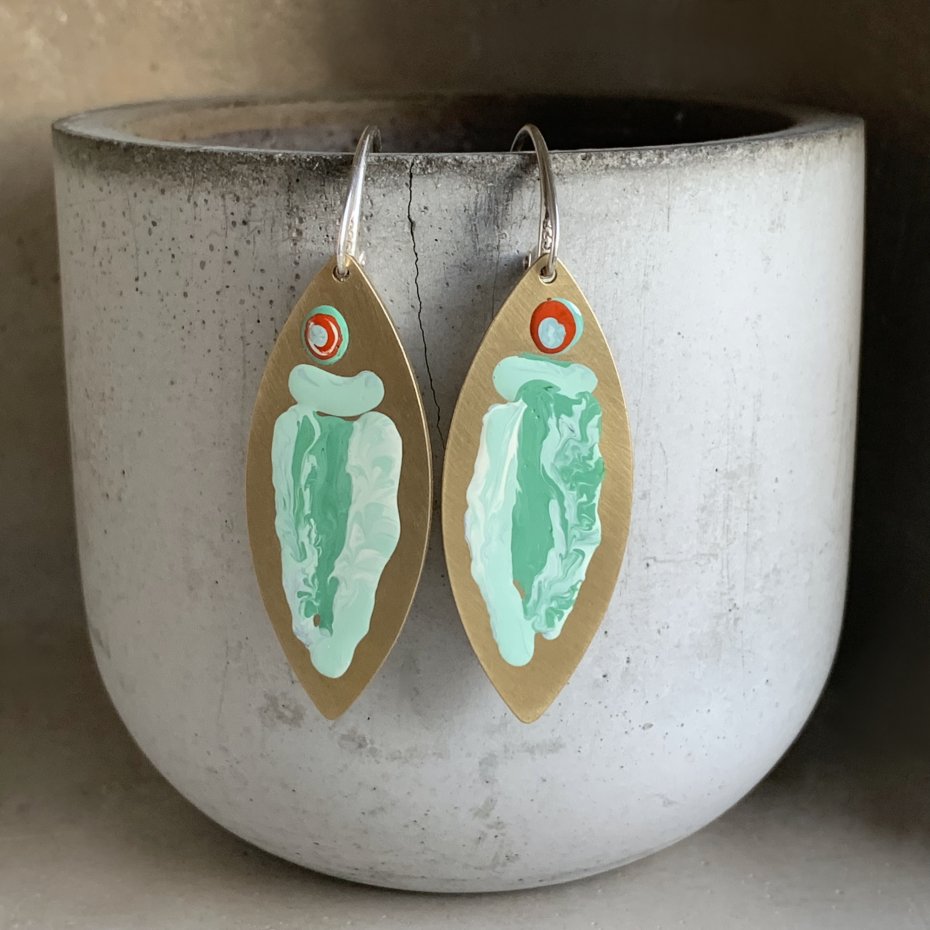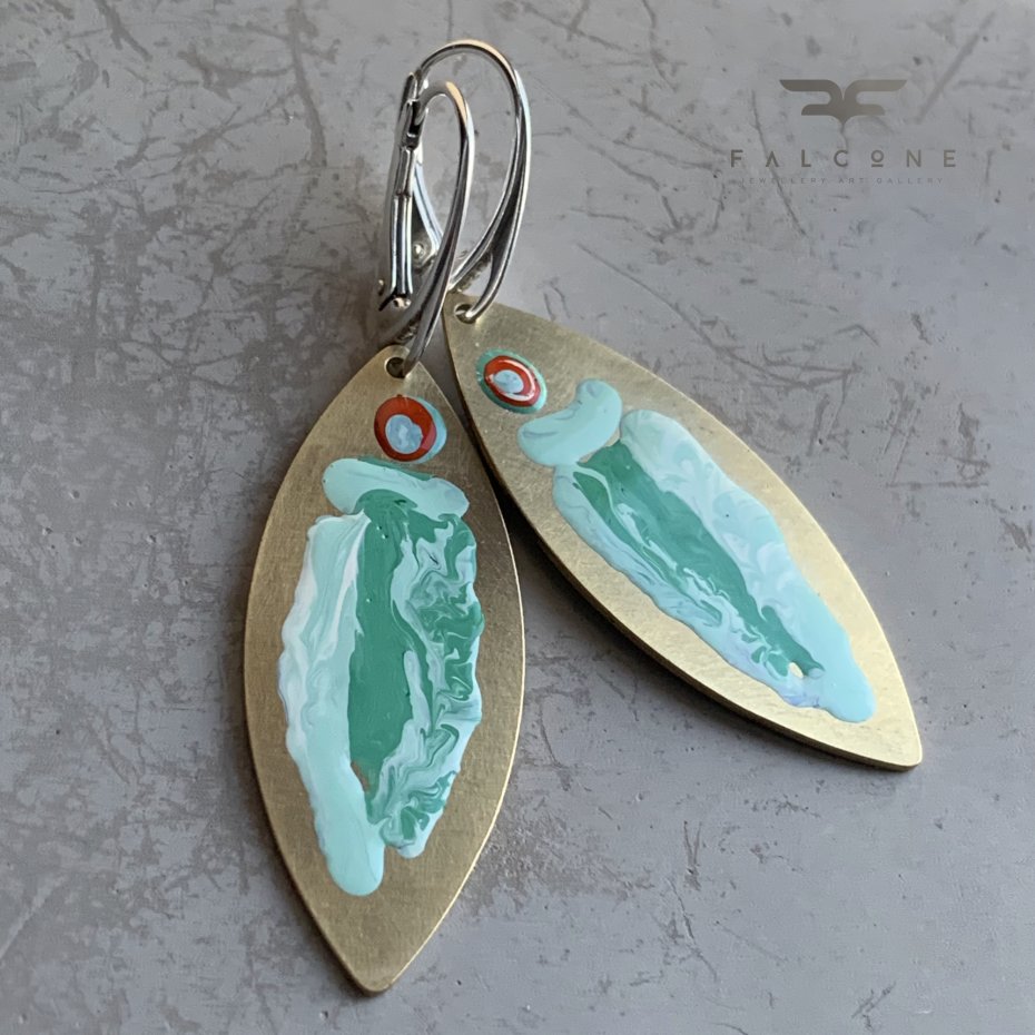 Kolczyki ze srebra i mosiądzu. Mosiądz w naturalnym kolorze, zdobiony emalią w unikalny wzór, inspirowany kolorystyką podwodnego świata. Zieleń w chłodnym odcieniu szałwii, przechodzi w pastelowy odcień seledynu z domieszką bieli. Subtelny akcent stanowią oczy, zdobione plamkami w kolorze ciepłej czerwień. Barwy łączone tak, aby uzyskać unikalny, niepowtarzalny efekt. Barwy, zmieniają się w zależności od natężenia światła. Bigle angielskie z jasnego srebra 925. Szerokość kolczyków to ok. 1,5 cm. Długość kolczyków to ok. 5,5 cm.
