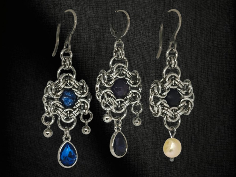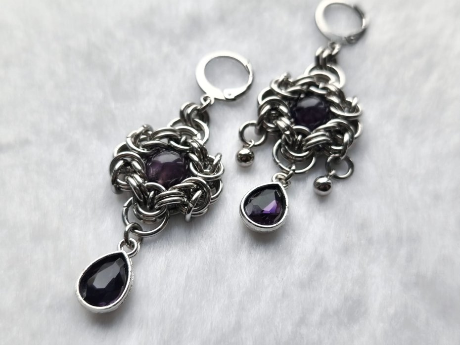 Ręcznie tkane kolczyki chainmaille z bardzo ciemnym, prawie czarnym ametystem i fioletową szklaną łezką. Idealne dla fanek gothic elf, night court, dark fairycore i velaris vibe!