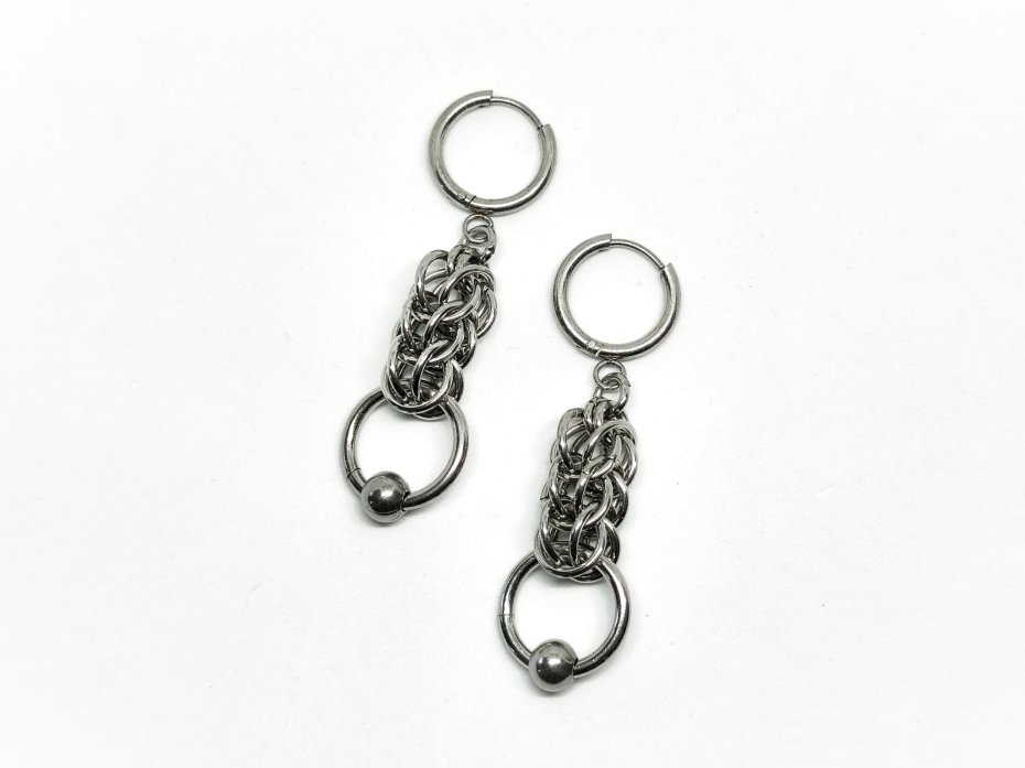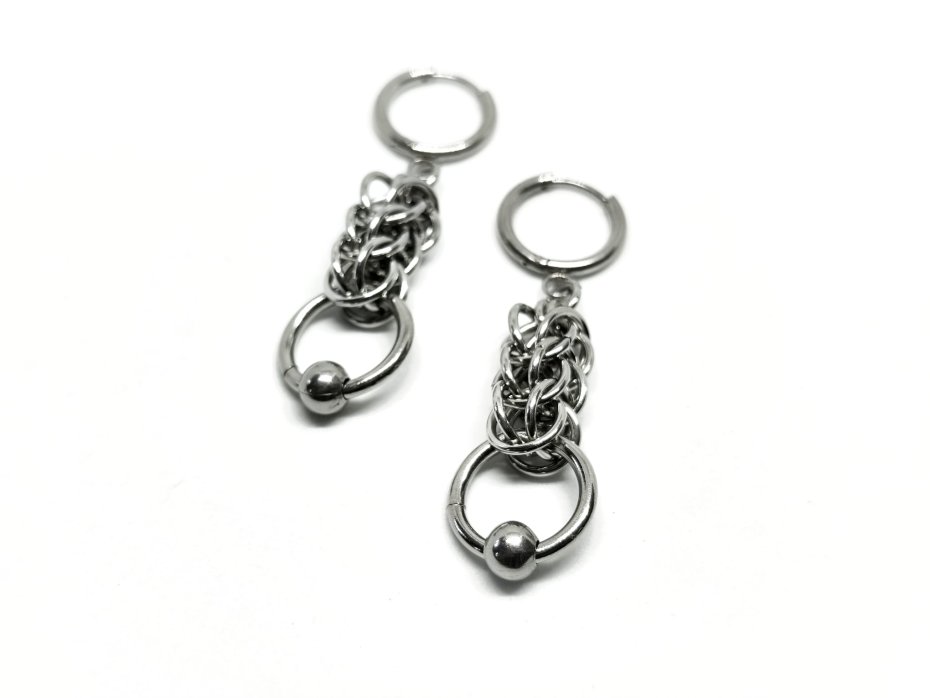 Długie kolczyki chainmaille ze stali chirurgicznej 316L – wydłużony łańcuszek z koralikiem ze stali nierdzewnej na dole, plecione jump rings, kuleczka ze stali nierdzewnej i solidne bigle ze stali chirurgicznej. Wodoodporne, hipoalergiczne, nie rdzewieją.