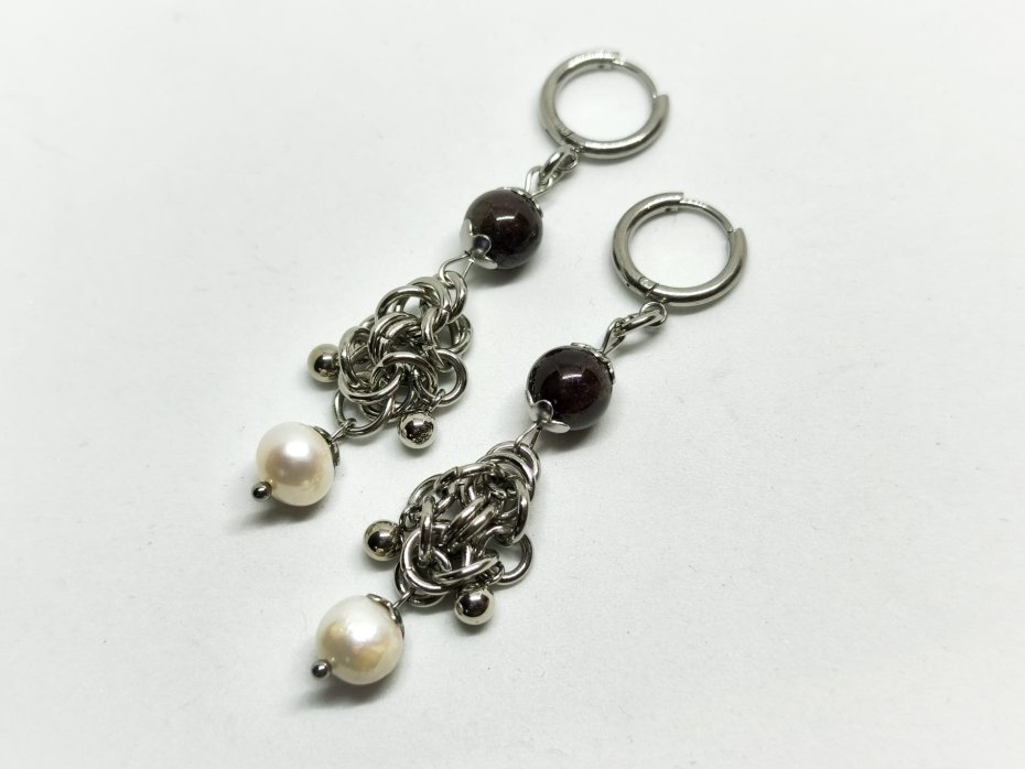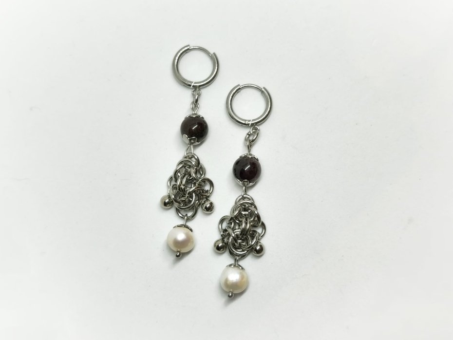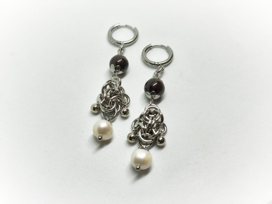 chainmaille, z granatem, z perłami naturalnymi, długie wiszące, stal chirurgiczna, gothic, dark romance, witchy, vampire, dark academia, whimsigoth, alternatywne, hipoalergiczne, wodoodporne, na koncert, festiwalowe, biżuteria kolczugowa, biżuteria mroczna, biżuteria alt, biżuteria gothic, biżuteria dark romance, biżuteria z granatem, biżuteria z perłami