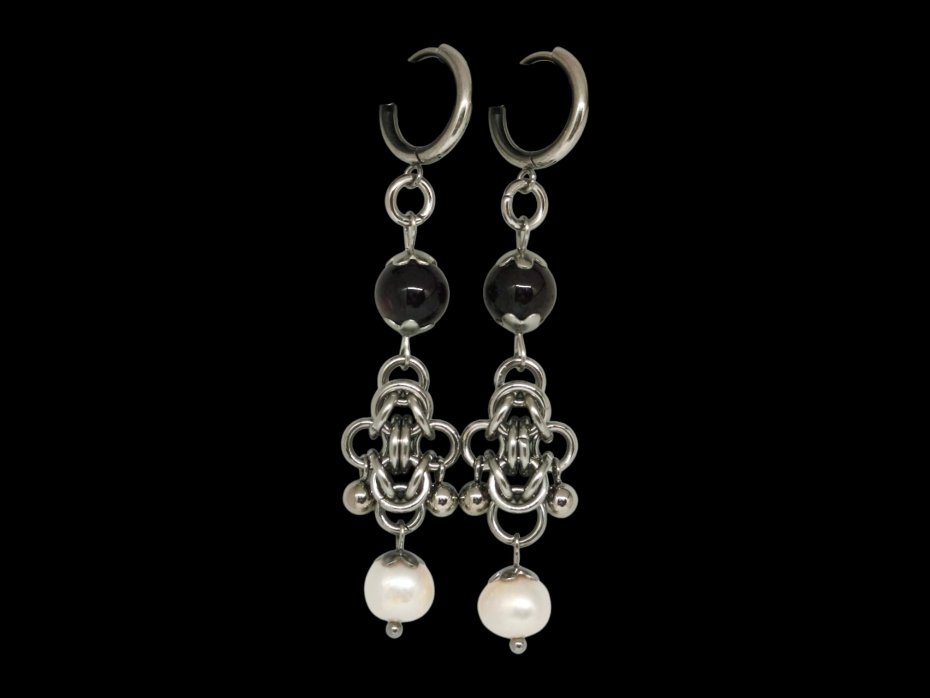 Mroczne, głębokie i bardzo eleganckie kolczyki chainmaille – gęsty splot ogniwek ze stali chirurgicznej 316L, wiszące kuleczki, podwójne ringi i centralny ciemny granat (bardzo nasycony, ciemny) oraz naturalne perły słodkowodne dodające mlecznego, perłowego kontrastu. Całość wygląda jak biżuteria z zimowego gotyckiego dworu albo mrocznej baśni – ciężar stali i delikatny blask kamieni w jednym.