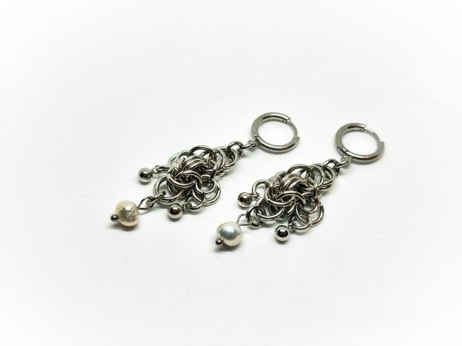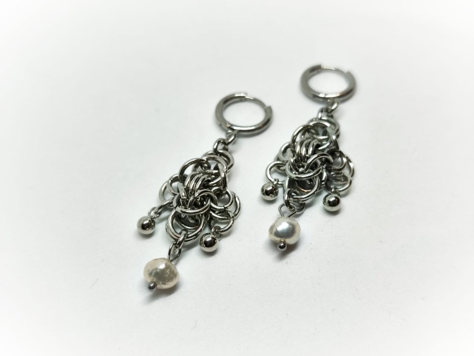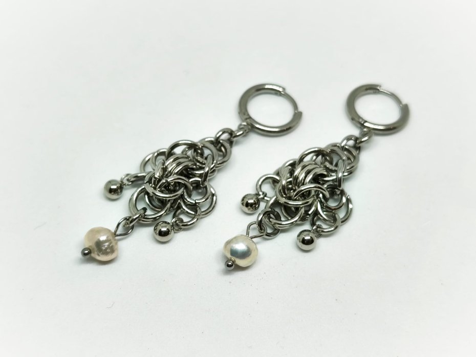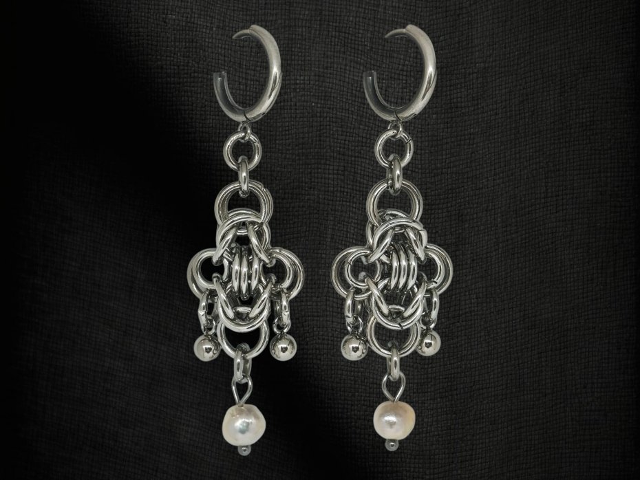 Chainmaille, z perłami, z perłami naturalnymi, długie wiszące, stal chirurgiczna, gothic, witchy, fantasy, elfickie, fairycore, hipoalergiczne, wodoodporne, alternatywne, na koncert, festiwalowe, biżuteria kolczugowa, biżuteria z perłami słodkowodnymi, biżuteria perłowa, biżuteria mroczna, biżuteria alt, biżuteria dark academia
