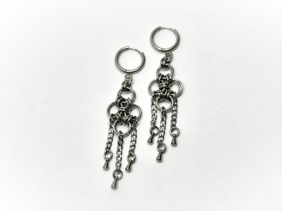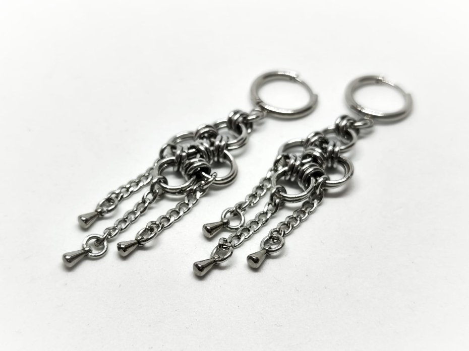 chainmaille, z cylindrami, industrial, cyber goth, punk, długie wiszące, stal chirurgiczna, hipoalergiczne, wodoodporne, na koncert, festiwalowe, biżuteria kolczugowa, biżuteria mroczna, biżuteria alt, biżuteria industrial, biżuteria cyber, biżuteria dystopijna