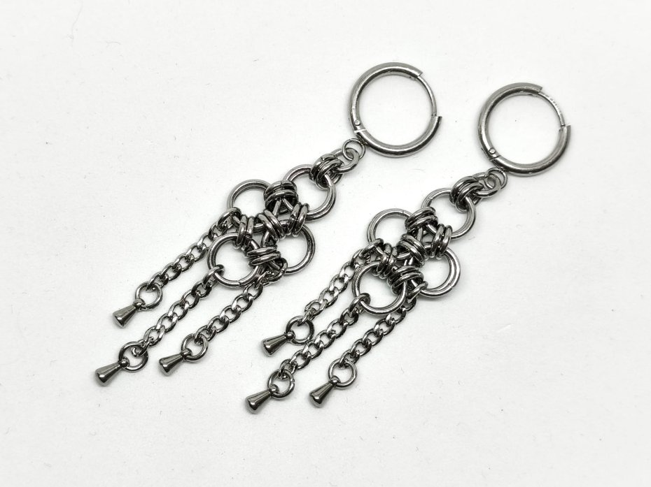 Geometryczne, surowe kolczyki chainmaille z cylindrycznymi zawieszkami – gęsty splot ze stali chirurgicznej 316L, wiszące ringi, łańcuszki i ostre, błyszczące cylindry ze stali nierdzewnej. Bigle stal chirurgiczna (wygodne, hipoalergiczne).