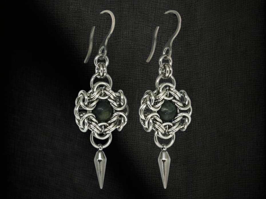 Kolczyki plecione chainmaille z naturalnym ciemnym jadeitem w centrum i ostrym kolcem ze stali nierdzewnej. Głęboki, matowy zielono-czarny odcień jadeitu w połączeniu z metalicznym połyskiem stali daje bardzo mroczny, tajemniczy efekt.