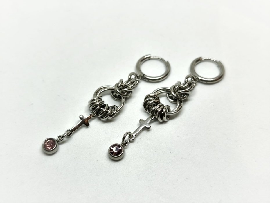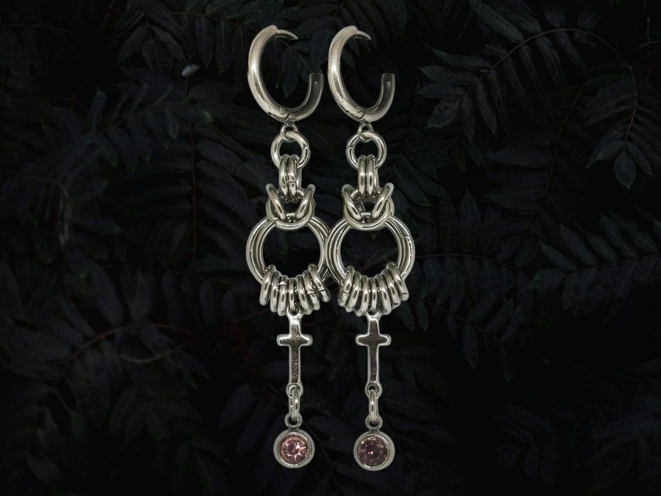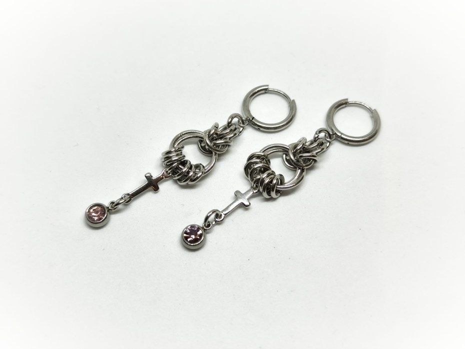 Mroczne, błyszczące kolczyki chainmaille z cyrkonią w kolorze jasnego różu – gęsty splot ogniwek ze stali chirurgicznej 316L. Cyrkonia mocno iskrzy, daje delikatny, ale zauważalny blask – idealny kontrast do surowej stali.