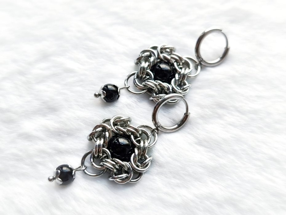 kolczyki z czarnym agatem, kolczyki chainmaille, kolczyki gothic, kolczyki black, kolczyki stal chirurgiczna, kolczyki naturalny kamień, kolczyki agat, kolczyki mroczne, kolczyki rękodzieło, kolczyki wiszące, biżuteria alternatywna, kolczyki gotyckie, glam, metalhead, na koncert