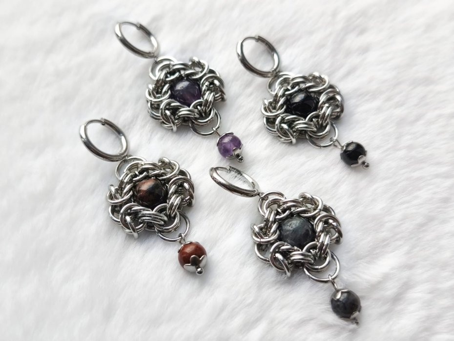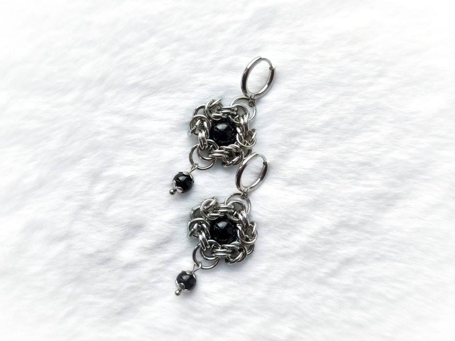 Mroczne, eleganckie kolczyki handmade z naturalnym czarnym agatem otoczonym gęstą plecionką chainmaille. Głęboka czerń kamienia i stalowy połysk tworzą hipnotyzujący, total black efekt. Wisząca kuleczka podkreśla ruch.