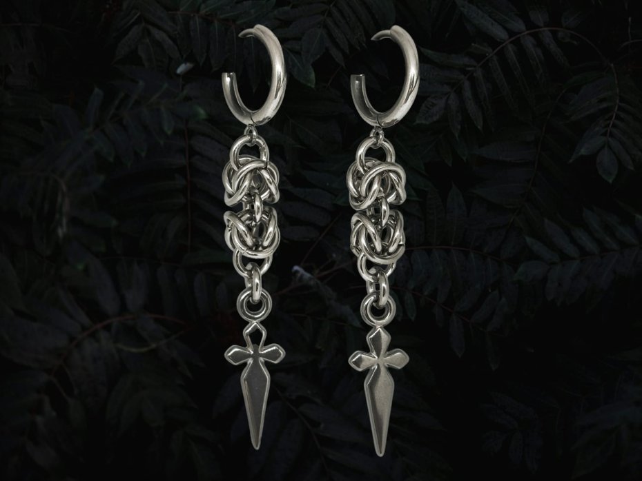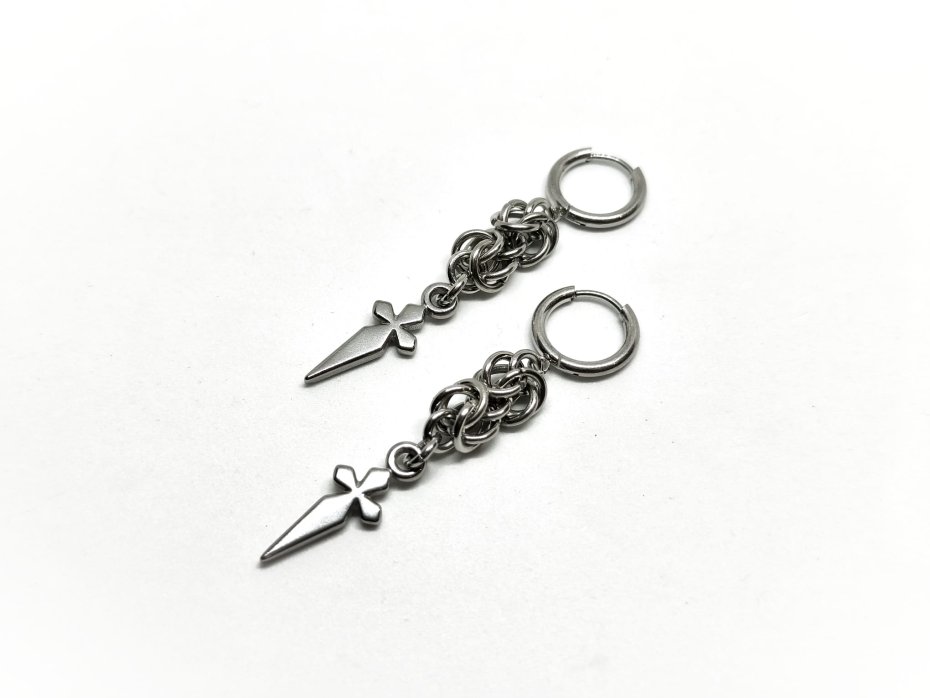 Mroczne, ostre kolczyki chainmaille z centralnym sztyletem/mieczem ze stali nierdzewnej – gęsty splot ogniwek ze stali chirurgicznej 316L. Bigle ze stali chirurgicznej – wygodne i bezpieczne. Wodoodporne, hipoalergiczne, nie rdzewieją, nie ciemnieją – nosisz non-stop.