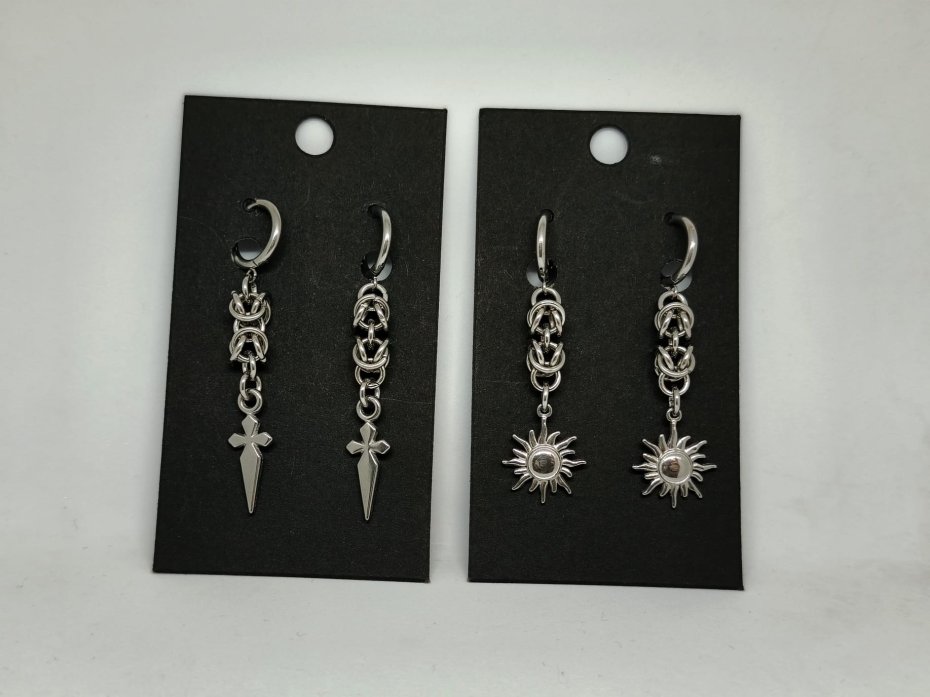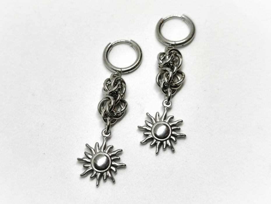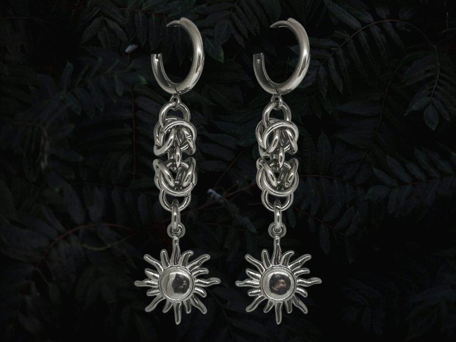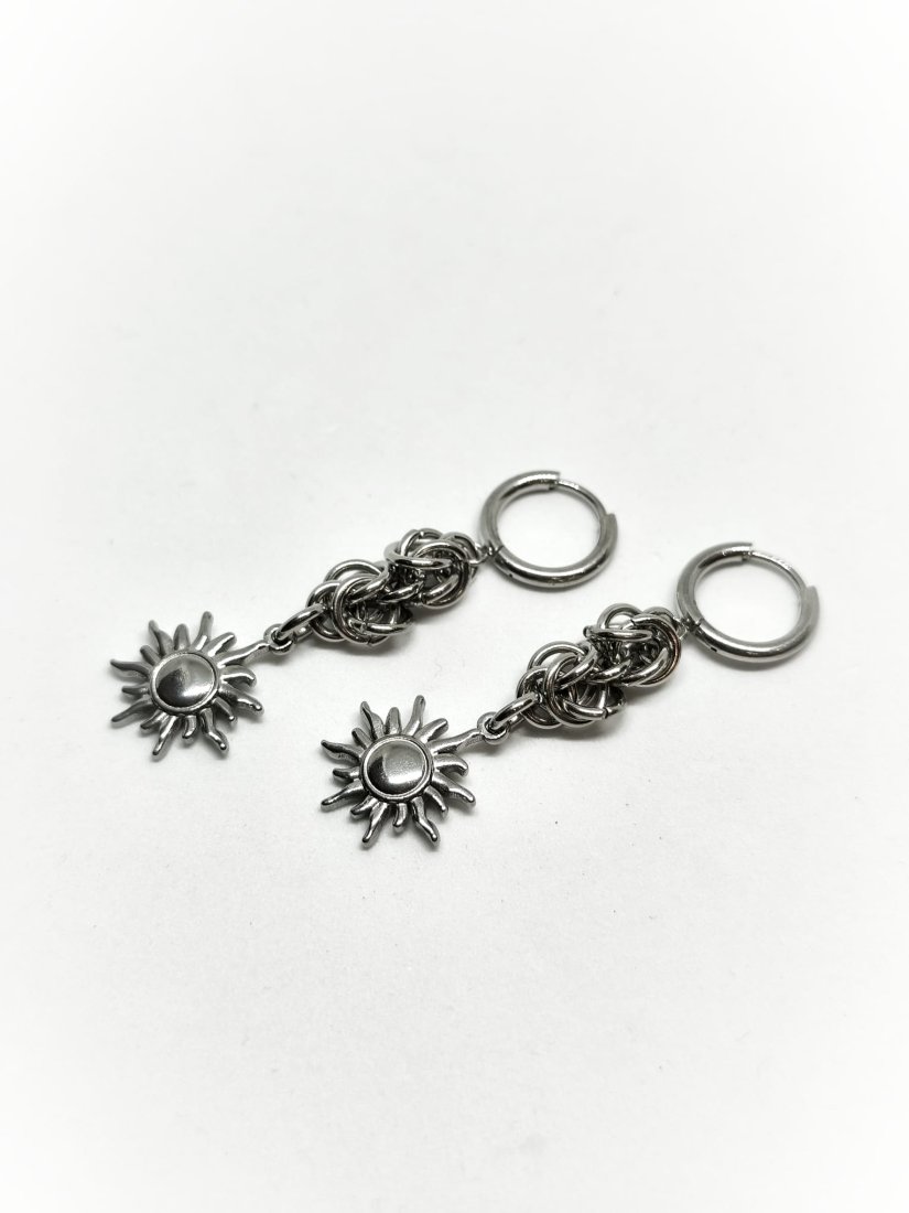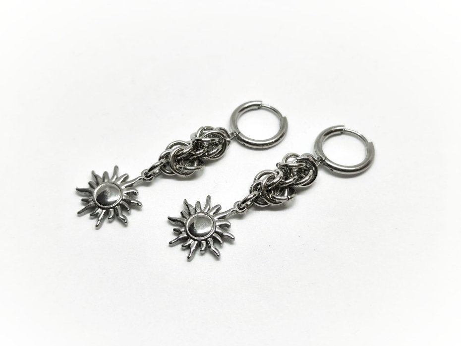 Kolczyki chainmaille, ze słońcem, długie wiszące, stal chirurgiczna, gothic, witchy, dark academia, dark romance, whimsigoth, alternatywne, hipoalergiczne, wodoodporne, na koncert, festiwalowe, biżuteria kolczugowa, biżuteria mroczna, biżuteria alt, biżuteria gothic, biżuteria witchy, biżuteria dark academia