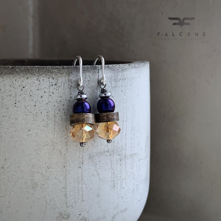 Kolczyki ze srebra, mosiądzu, kamieni i szkła. Kolczyki w nowoczesnej, nietuzinkowej formie. Fasetowane oponki z przejrzystego szkła w kolorze szampana, tworzą kompozycję z gładkimi kuleczkami hematytu, w kolorze ciemnego fioletu. Całość dopełnia nowoczesna kryza w stylu retro, z mosiądzu, patynowanego nierównomiernie na gorzki brąz. Bigle typu haki z polerowanego srebra 925. Średnica oponek to ok. 8 mm. Długość kolczyków to ok. 3 cm.
