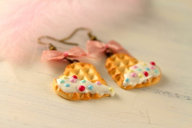 Mam do zaoferowania własnoręcznie wykonane z fimo kolczyki ciasteczka z posypką ozdobione kokardkami. Całość zabezpieczona werniksem.