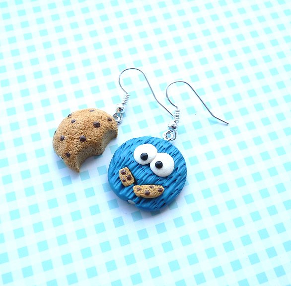 Urocze kolczyki - Ciasteczkowy potwór i ugryzione ciastko:) średnica potworka i ciastka: ok.2cm, długość całkowita kolczyka: ok. 4-4,5cm. Wysyłam ozdobnie zapakowane;)