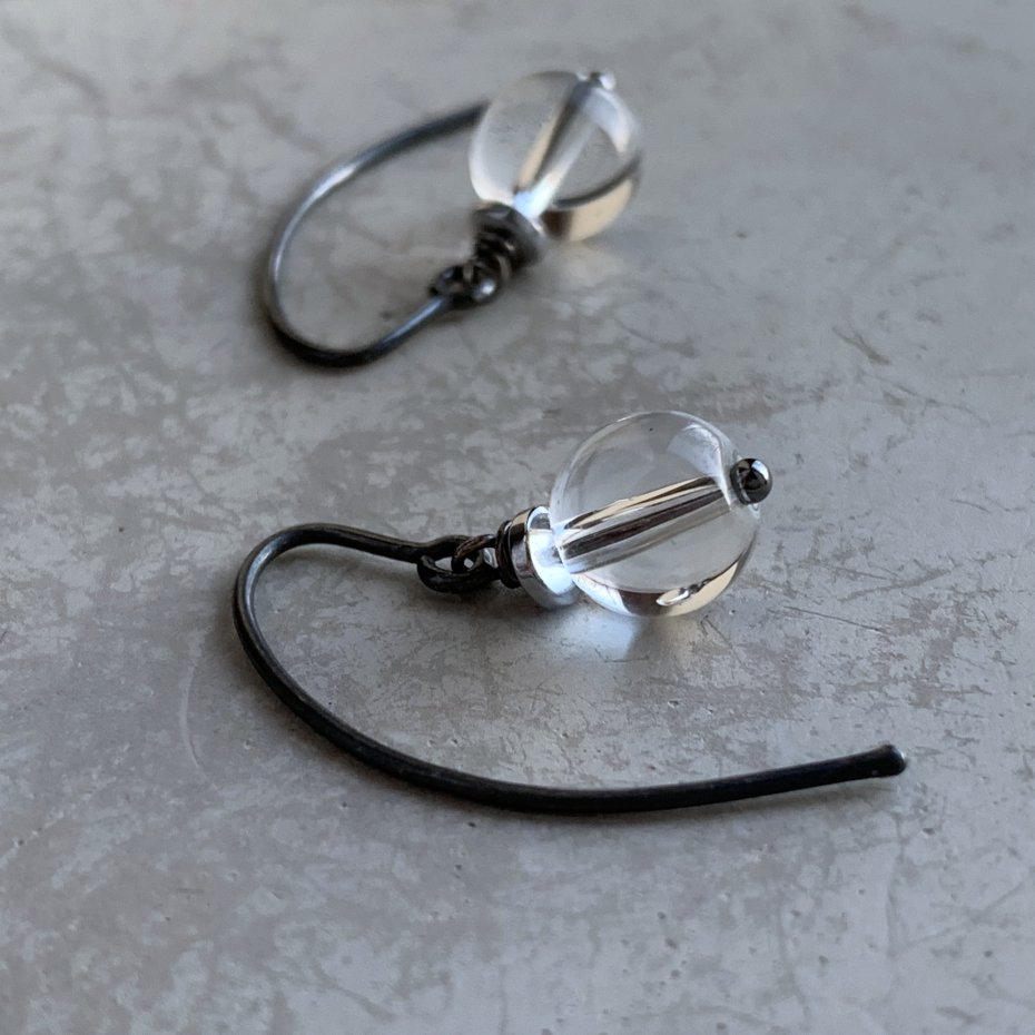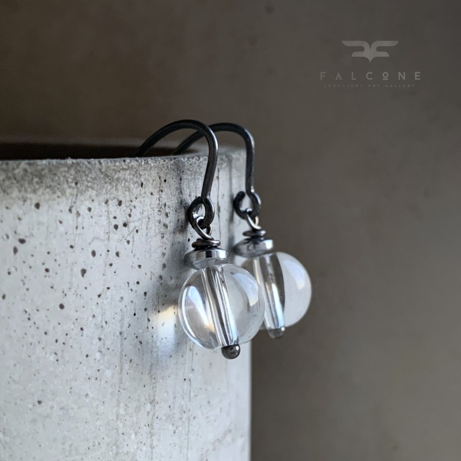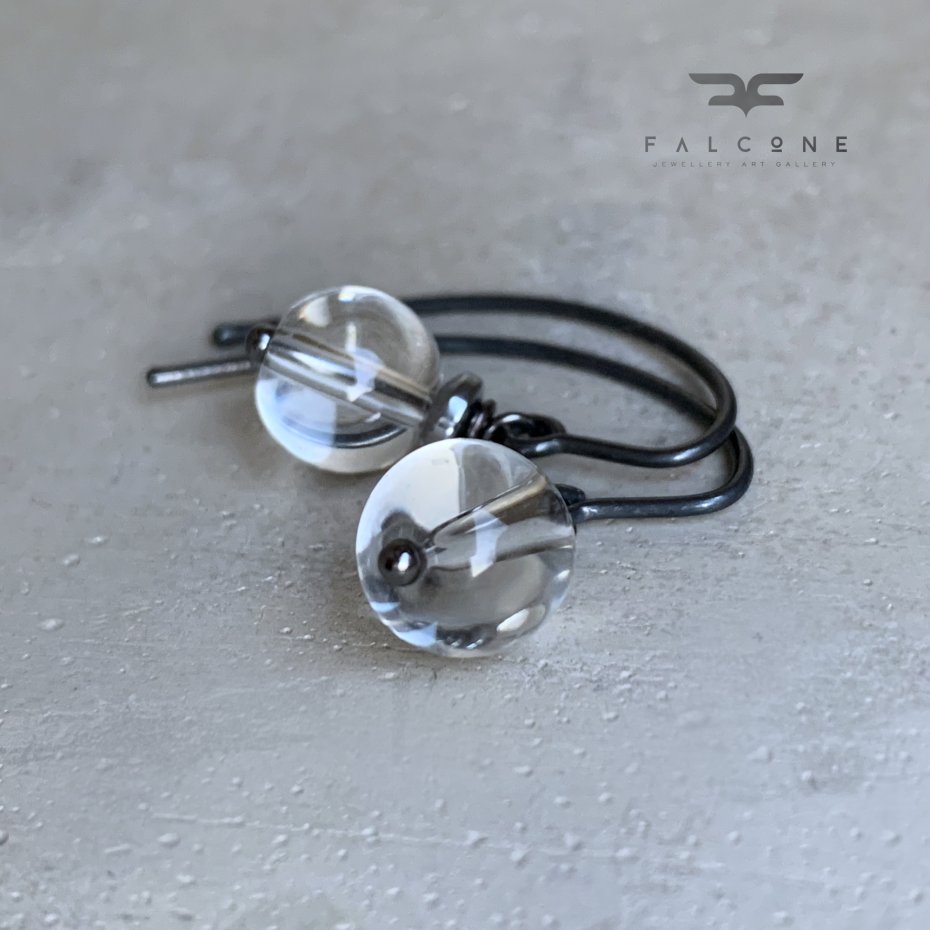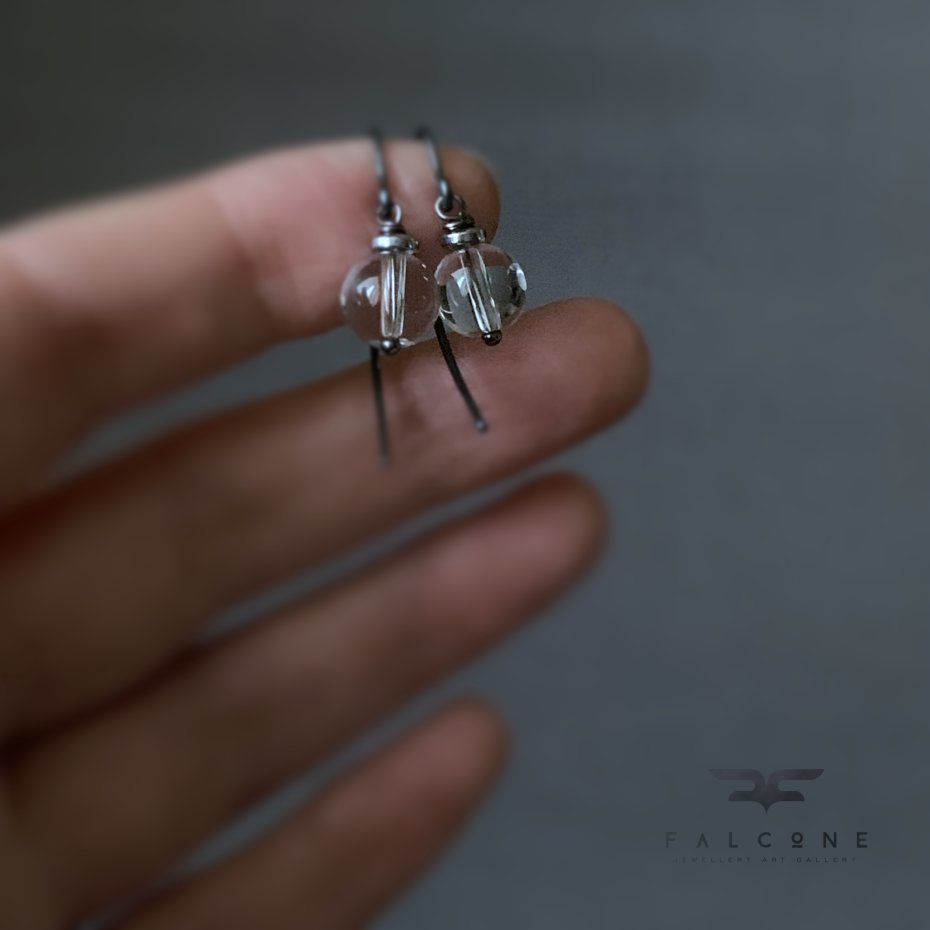 Kolczyki ze srebra i przejrzystego kryształu. Gładko szlifowane kule ze szkła kryształowego, chłodne w dotyku, przejrzyste jak krople wody. Dla podkreślenia ich eteryczności oprawione w platerowane srebrem hematyty i kontrastujące ciemne srebro. Średnica kul to 8 mm. Bigle typu haki ze srebra 925. Długość kolczyków to ok. 3 cm.