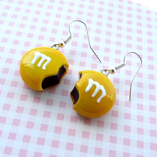 Urocze kolczyki - miniaturowe nadgryzione cukierki m&ms:) średnica cukierka: ok.2cm, długość całkowita kolczyka: ok. 4cm. Wysyłam ozdobnie zapakowane;)