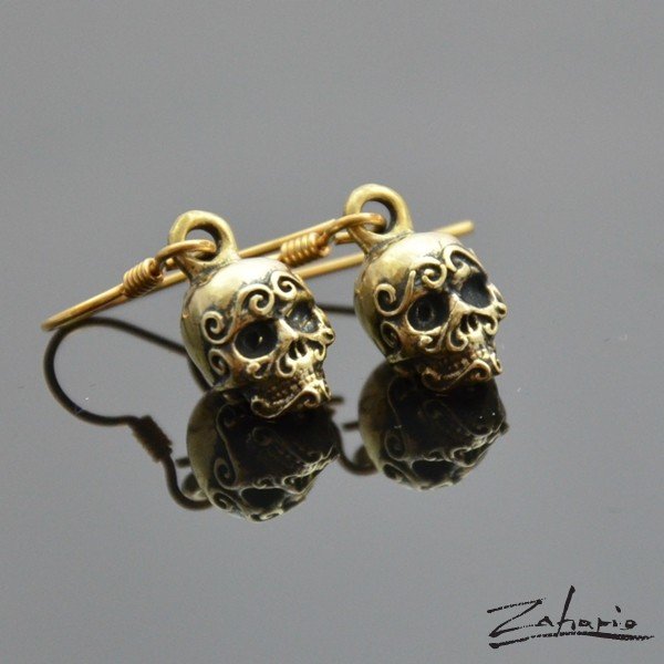 Kolczyki w kształcie czaszek zdobionych, wykonane ręcznie, w całości z brązu. Żłobienia i detale tworzone pod lupą.