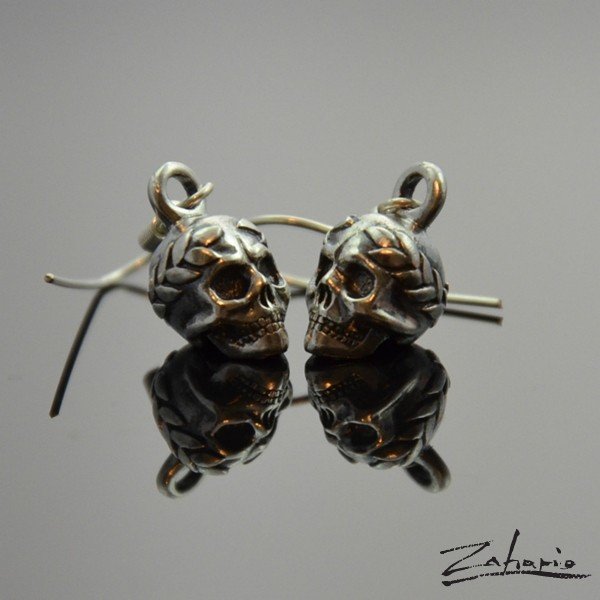 Kolczyki w kształcie czaszek z wieńcem laurowym, ręcznie robione, w całości wykonane ze srebra. Żłobienia i detale tworzone pod lupą.