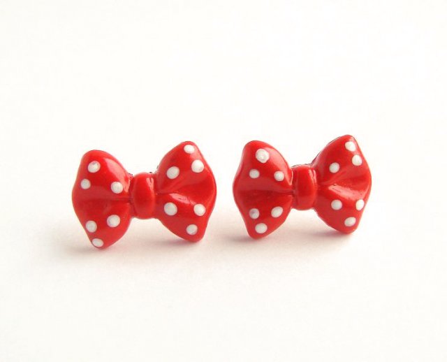 Urocze kolczyki sztyfty czerwone kokardki w kropeczki wykonane z masy fimo. Wielkość: 2 cm, zatyczki w zestawie