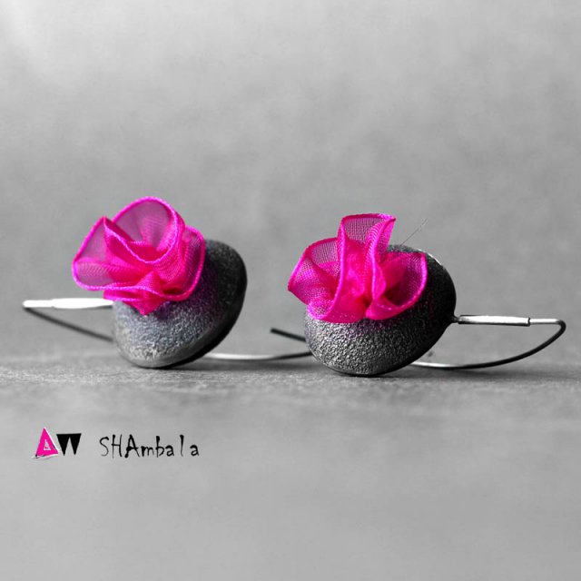 Duże, Oryginalne, nowoczesne kolczyki wykonane z oksydowanego, fakturowanego srebra i jedwabnej organzy w kolorze soczystej fuksji. Awangardowe i eleganckie, o asymetrycznym charakterze. Średnica kolczyków - 2,5 cm. Całkowita długość kolczyków - ok. 6 cm.