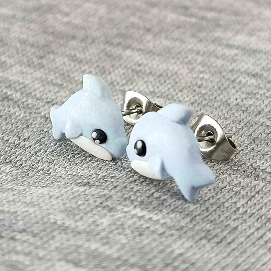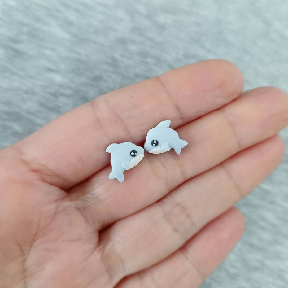 Ręcznie wykonane kolczyki sztyfty w kształcie uroczych delfinów. Delikatny, pastelowy błękit i subtelne detale sprawiają, że są lekkim i radosnym akcentem inspirowanym podwodnym światem.