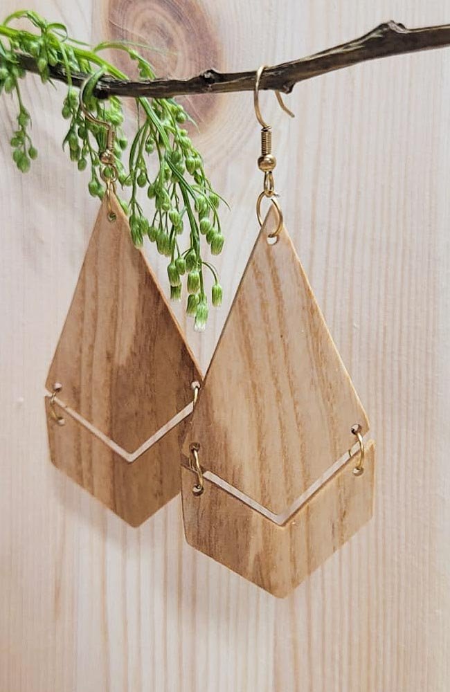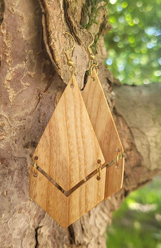 Geometryczne kolczyki wykonane ręcznie z drewna jesionowego lub z egzotycznego drewna cumaru (do wyboru). Elementy drewniane starannie szlifujemy i zabezpieczamy olejem.