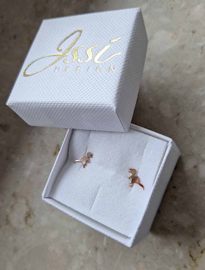 Kolczyki w kształcie dinozaurów T-Rex wykonane ze srebra 925 pokrytego różowym złotem. Zapinane na sztyft.