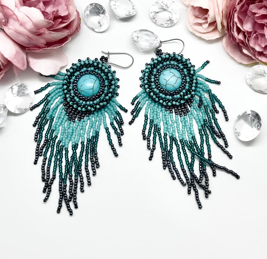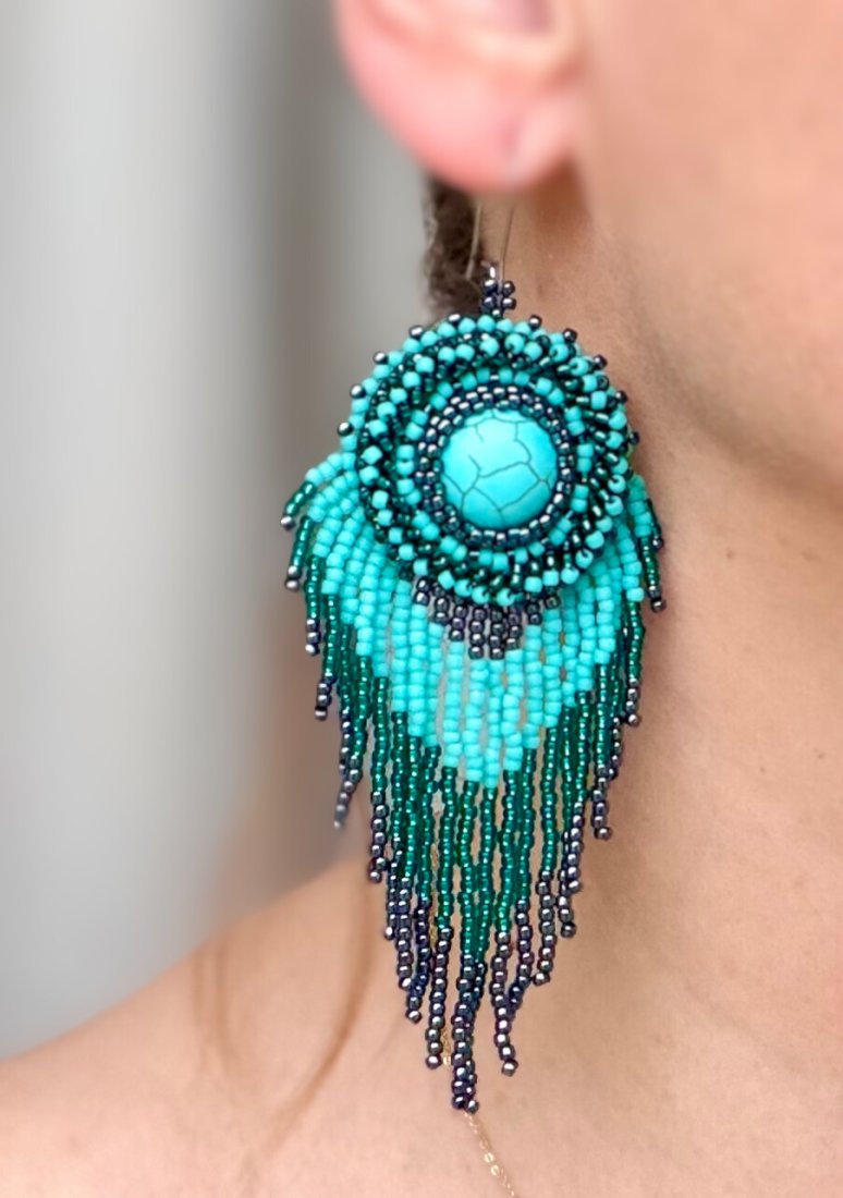 Te unikalne kolczyki to prawdziwe dzieło sztuki haftu koralikowego. Wykonane z dbałością o każdy detal, łączą w sobie stal chirurgiczną z delikatnymi koralikami w odcieniach turkusu. Centralnym punktem jest piękny, okrągły element imitujący turkus, otoczony misternie ułożonymi koralikami, które tworzą efektowny, falujący wzór. Długość kolczyków i ich dynamiczny kształt dodają im wyrazistości i ruchu, idealnie komponując się zarówno z codziennymi, jak i wieczorowymi stylizacjami.