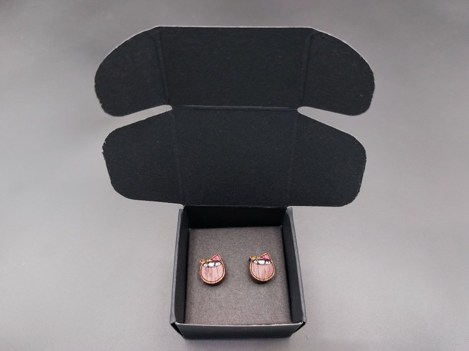 Kolczyki pakuję w kartonowe pudełeczko widoczne na zdjęciu.