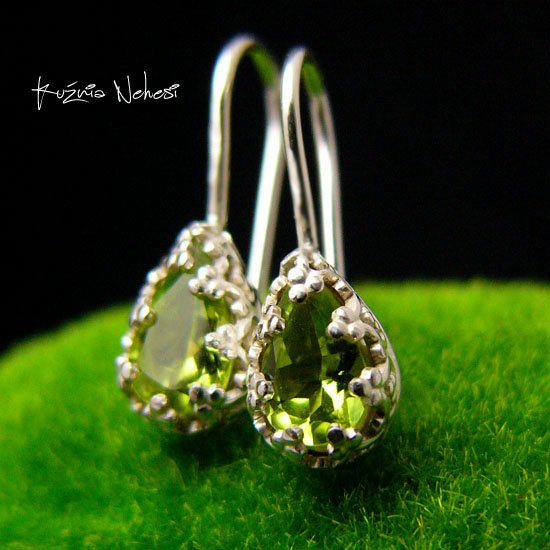 Kolczyki drobinki, niezwykle eleganckie. Wykonane ręcznie od podstaw ze srebra, tradycyjną technika jubilerską oraz ślicznych zielonych Oliwinów o szlifie diamentowym - wielkość - 20x7 mm. Srebro zostało mocno wypolerowane na lustro. Kolczyki bardzo lubiane, minimalizm połączony z elegancją.© Nehesi Design