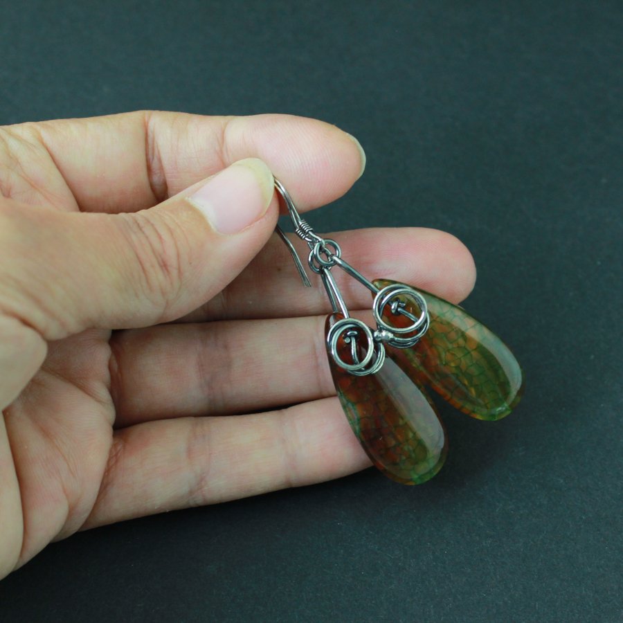W tych kolczykach z oksydowanego srebra próby 925 zaklęto ciszę jesiennego lasu tuż przed zmierzchem. Długie na 6,2 cm, o szerokości 1,5 cm, niosą w sobie kroplowy kształt agatu – jakby dwie łzy światła spływały po pniu starego drzewa. Kamień pulsuje mozaiką barw: głęboka zieleń przypomina omszałe skały i liście przykryte cieniem, zaś ciepła rudość miesza się z miodowym brązem, jak zachodzące słońce odbite w leśnym strumieniu. Wzór delikatnie popękanej struktury wprowadza wrażenie organicznej, niemal zwierzęcej energii – jakby agat oddychał własnym rytmem.