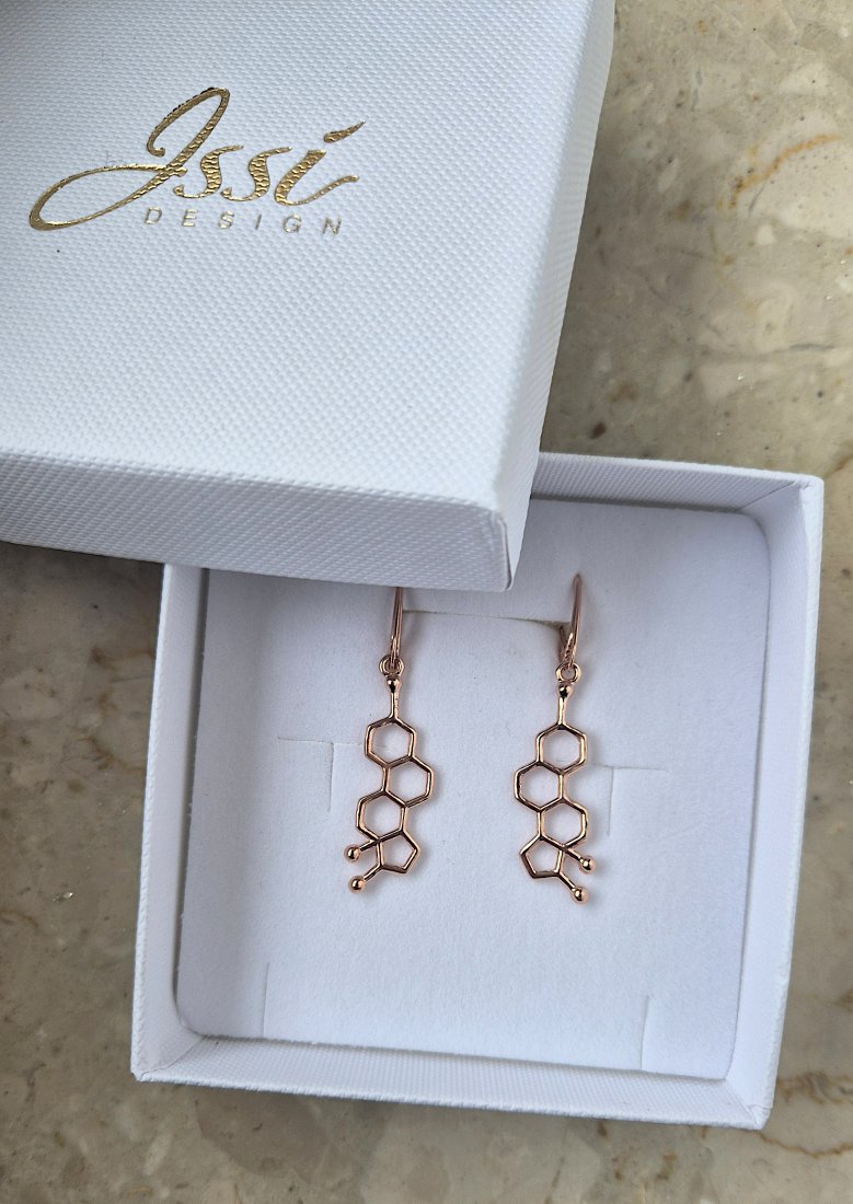 Kolczyki w kształcie wzoru strukturalnego estrogenu, wykonane ze srebra 925 pokryte 18K różowym złotem. Zapinane na bigiel angielski.