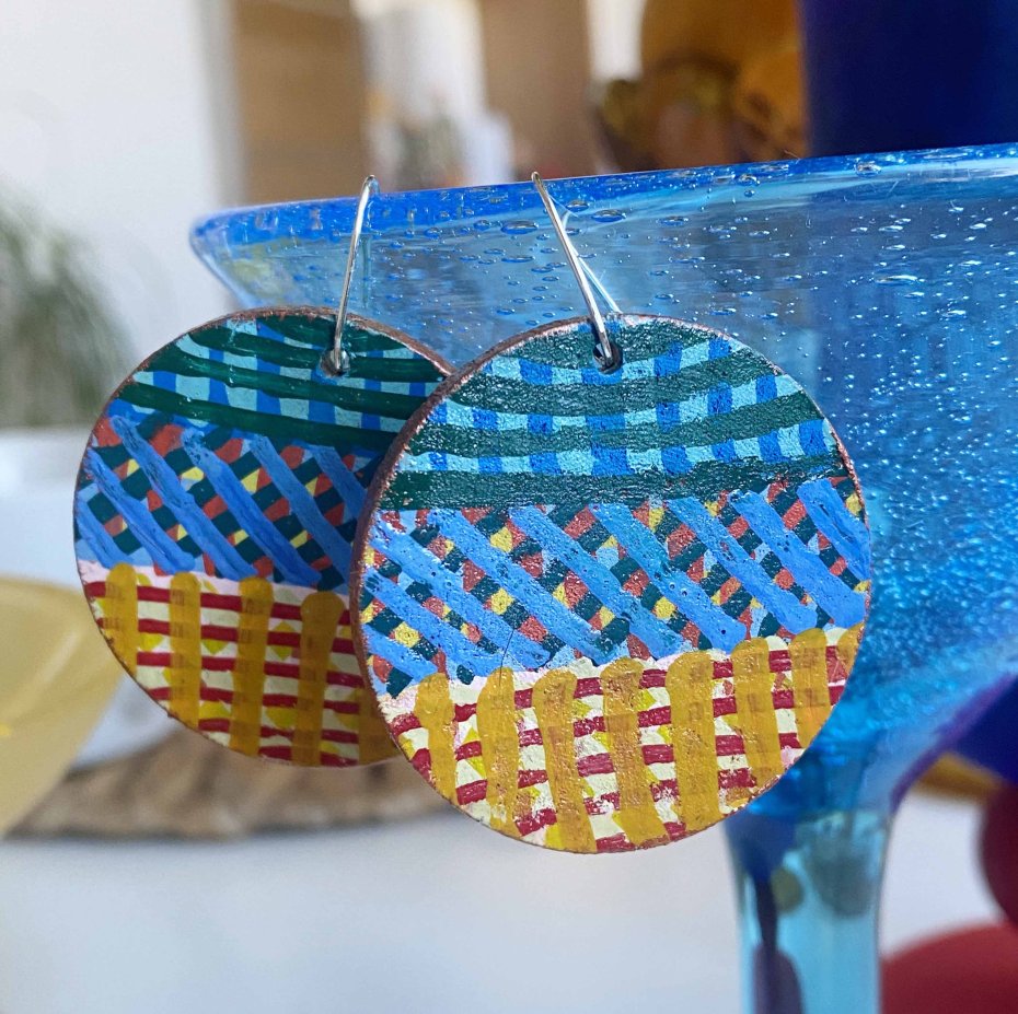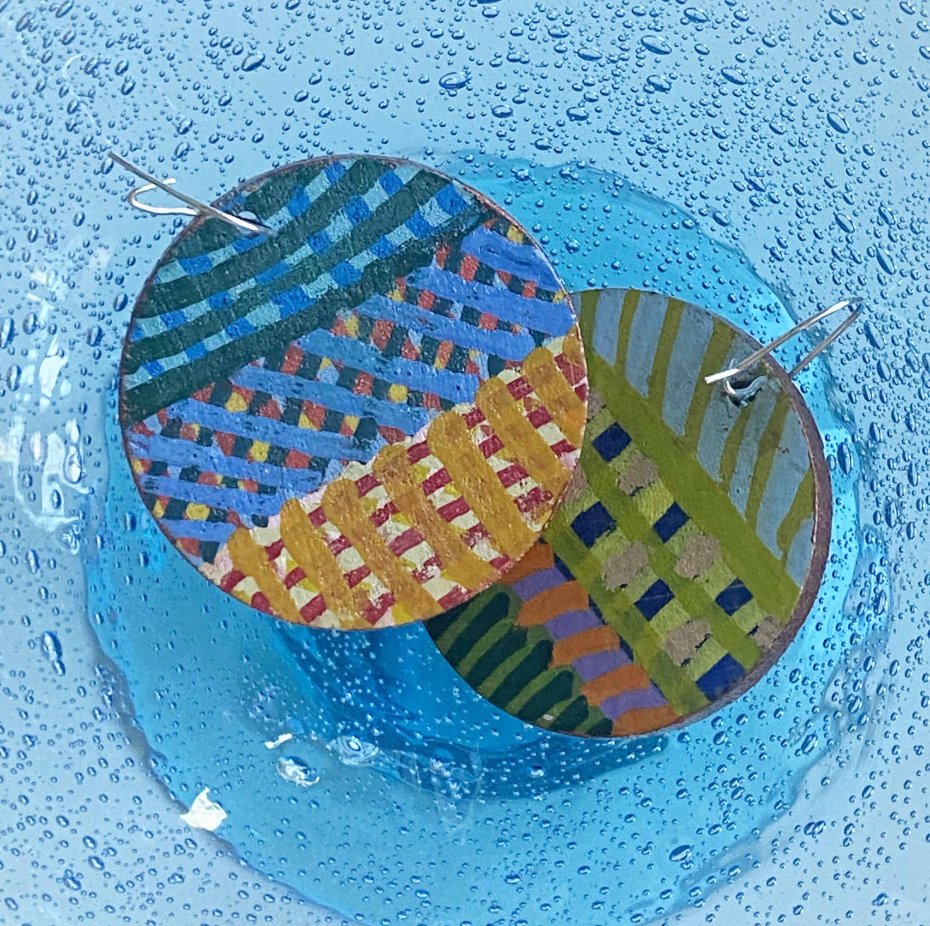 Lekkie drewniane kolczyki malowane dwustronne. Średnica kółek - 38 mm. Sztyfty ze srebra.