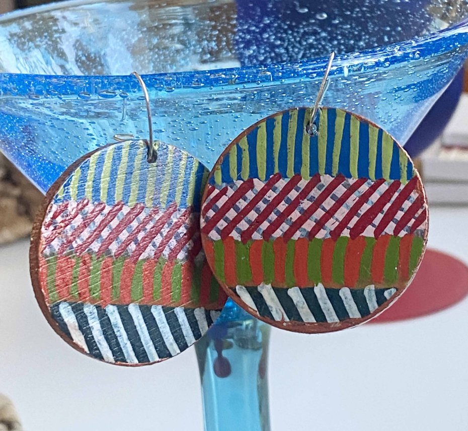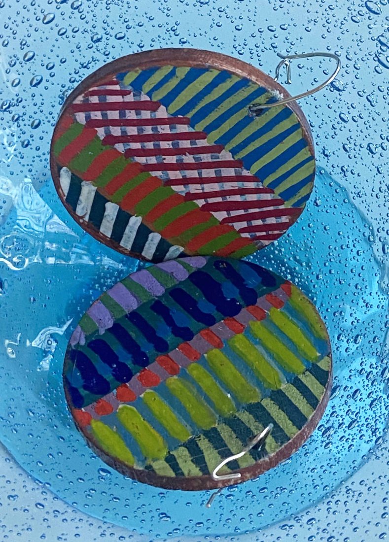 Lekkie drewniane kolczyki malowane dwustronne. Średnica kółek - 38 mm. Sztyfty ze srebra.