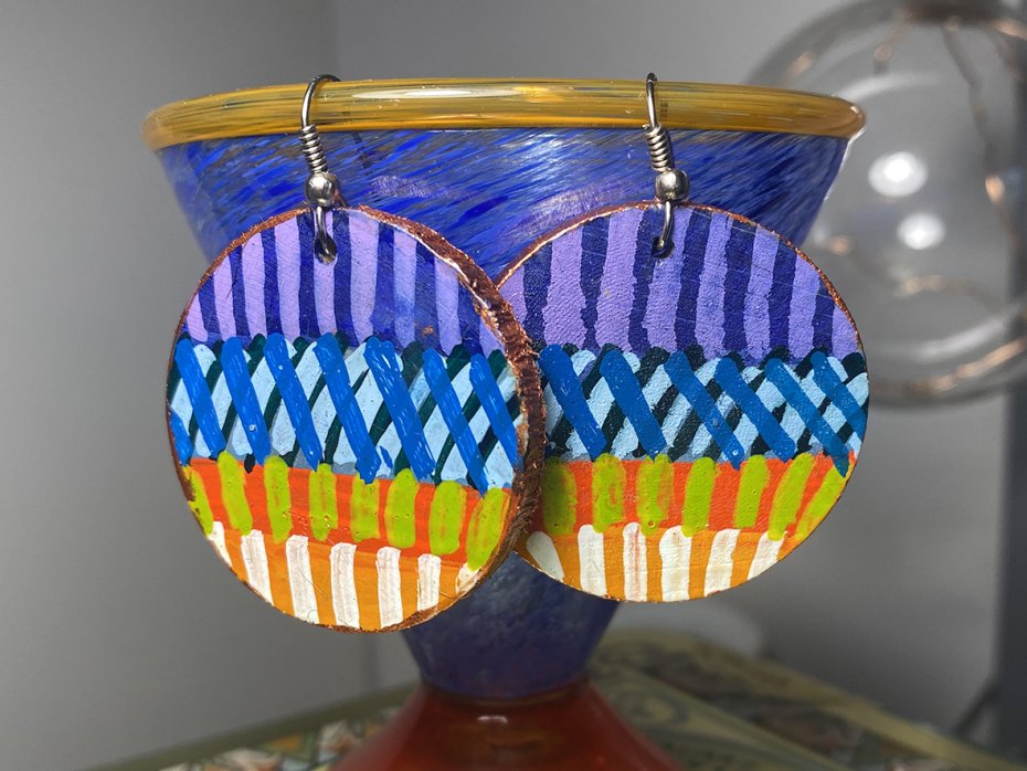 Kolczyki drewniane malowane farbami akwarelowymi i akrylowymi, zabezpieczone werniksem akrylowym.
