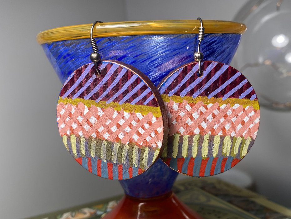 Kolczyki drewniane malowane farbami akwarelowymi i akrylowymi, zabezpieczone werniksem akrylowym.