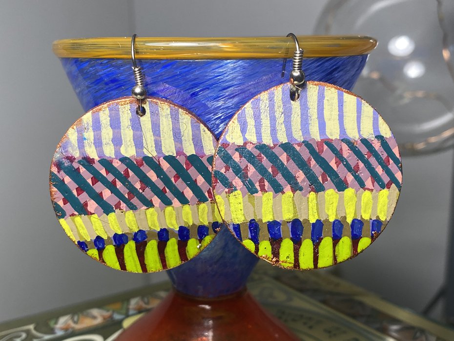 Kolczyki drewniane malowane farbami akwarelowymi i akrylowymi, zabezpieczone werniksem akrylowym.