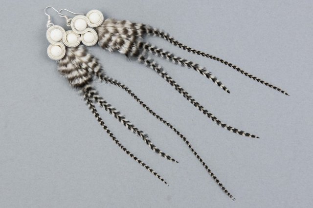 Kolczyki wykonane techniką soutache, przyozdobione długimi, naturalnymi, niezwykle efektownymi piórkami, podszyte miękkim filcem.