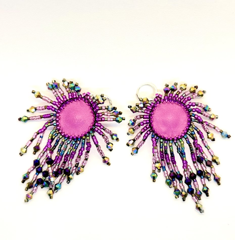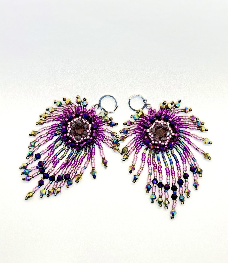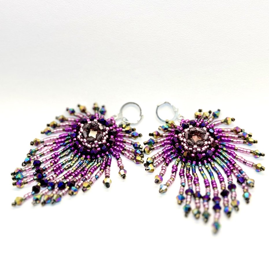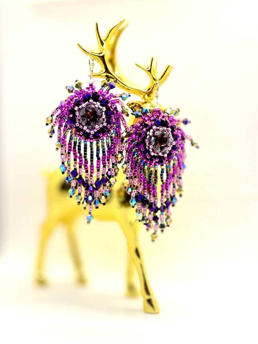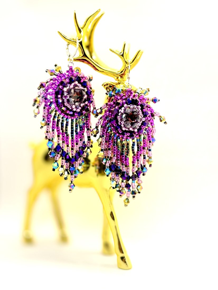 Przedstawiam unikalne kolczyki, które zachwycą każdą miłośniczkę wyrazistej biżuterii. Te ręcznie wykonane kolczyki na bigle ze stali chirurgicznej to połączenie elegancji i oryginalnego designu. Centralnym elementem są duże, owalne kamienie w intensywnym fiolecie, otoczone lśniącymi kryształkami w odcieniach fioletu, różu i błękitu. Delikatne, długie frędzle z drobnych koralików dodają im dynamiki i lekkości, tworząc efektowny ruch przy każdym poruszeniu.