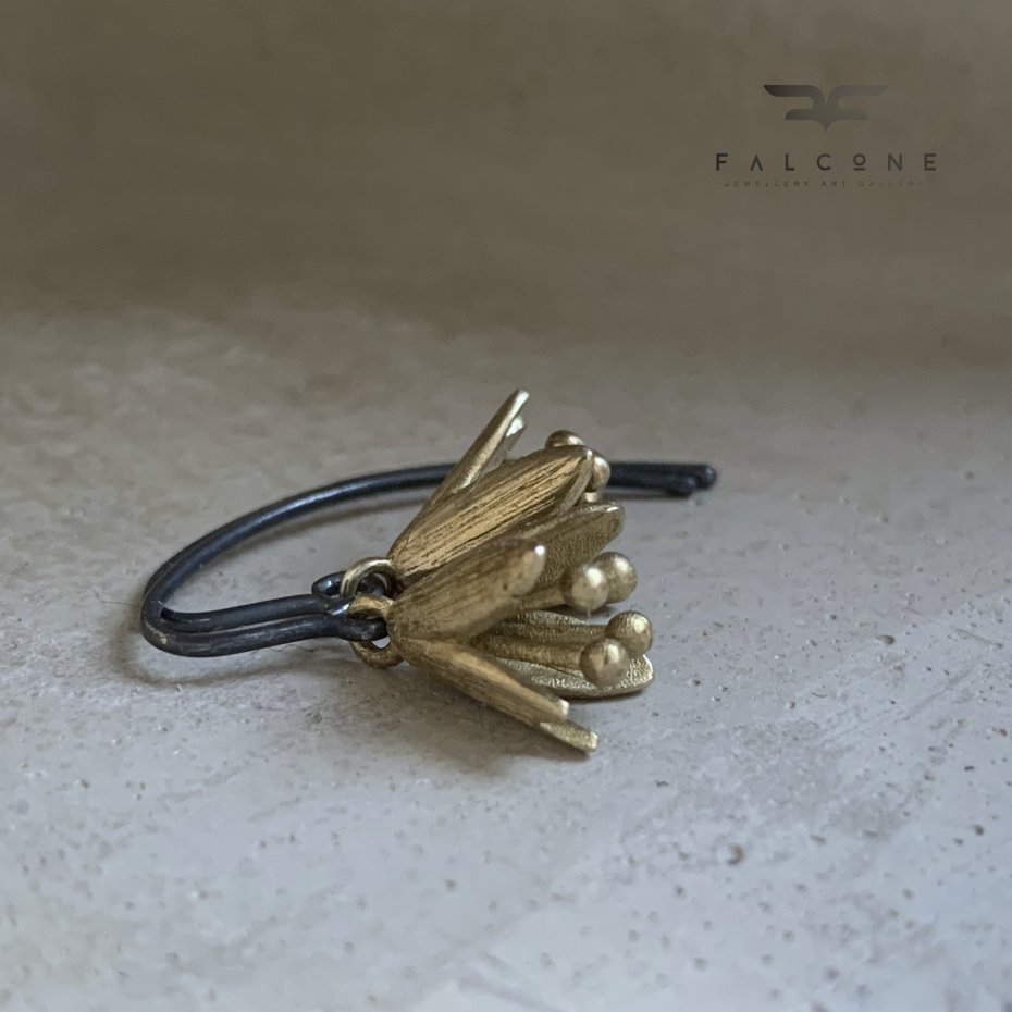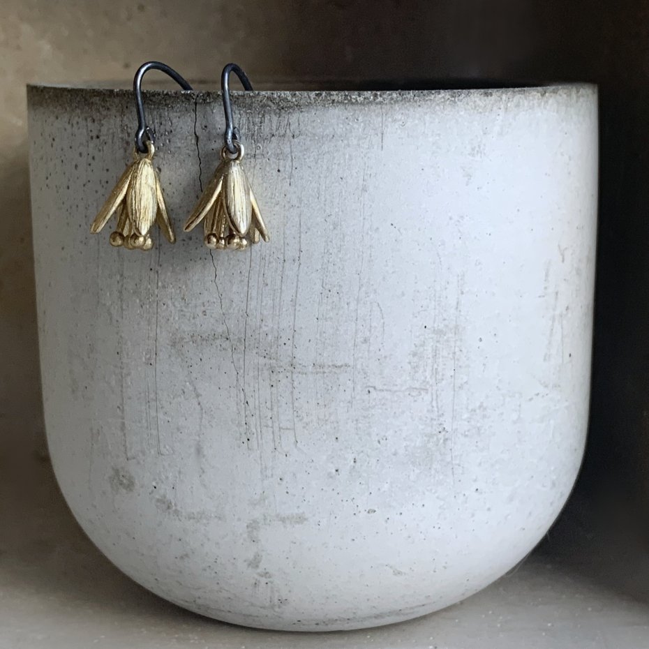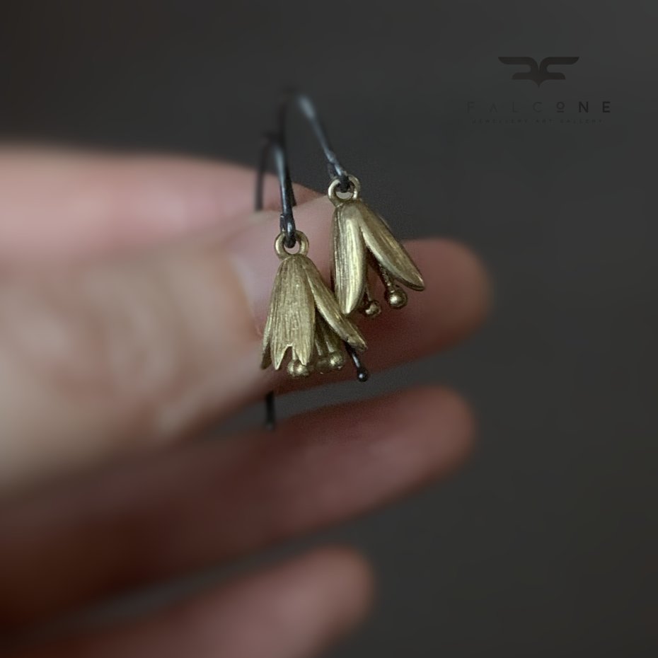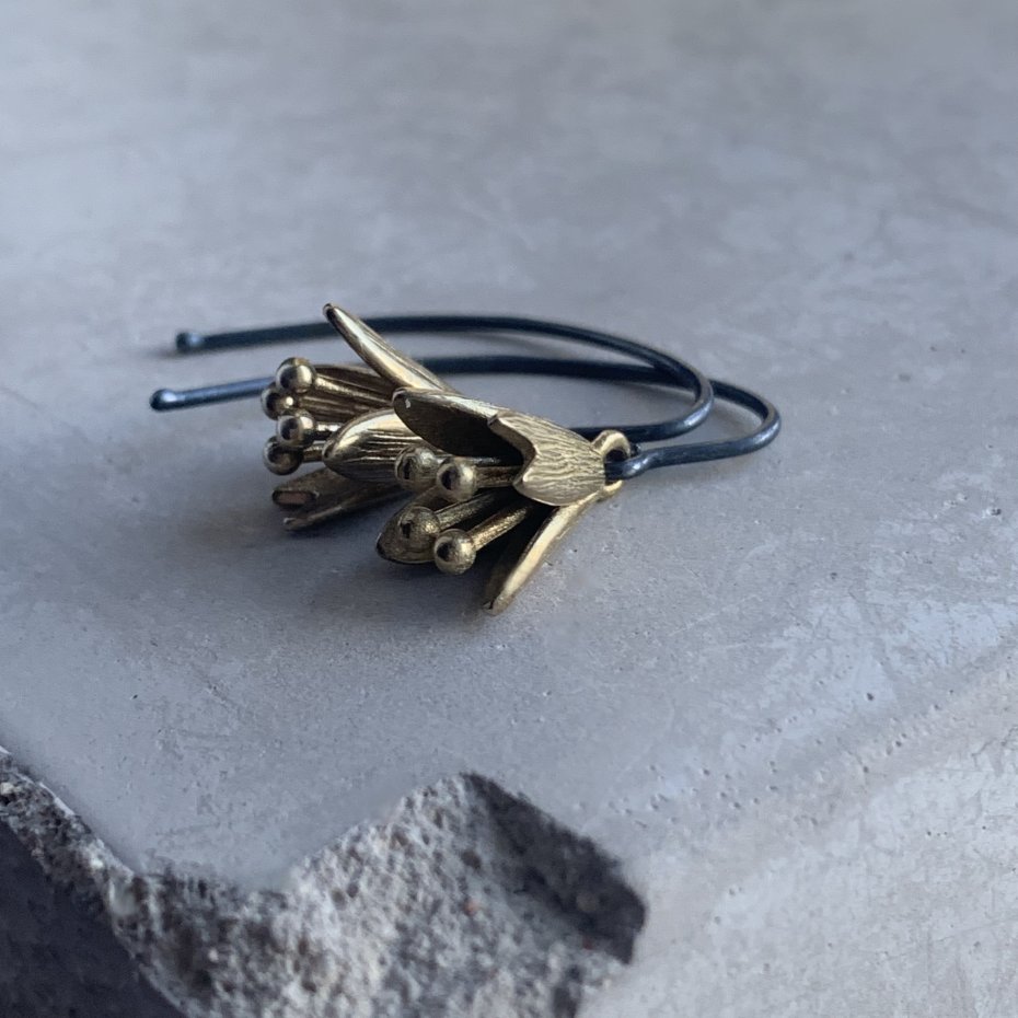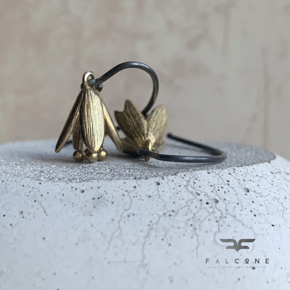 Kolczyki ze srebra i mosiądzu. Kolczyki w postaci kwiatowych dzwonków z mosiądzu. Kwiaty mają barwę naturalnego mosiądzu, która koresponduje z ich wyrazistą formą. Zawieszone na biglach z oksydowanego srebra. Bigle typu haki ze srebra 925. Średnica kwiatów to ok. 1 cm. Długość kolczyków to ok. 3 cm.